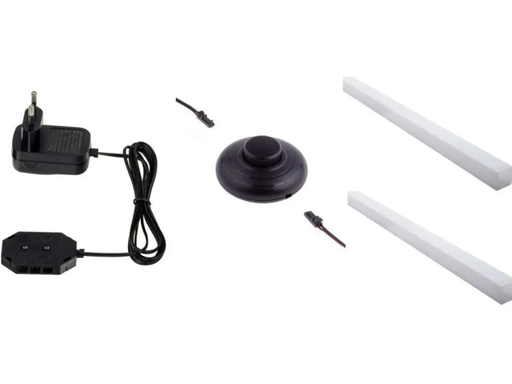 W skład zestawu wchodzą dwie listwy LED z wyłącznikiem nożnym oraz zasilaczem.