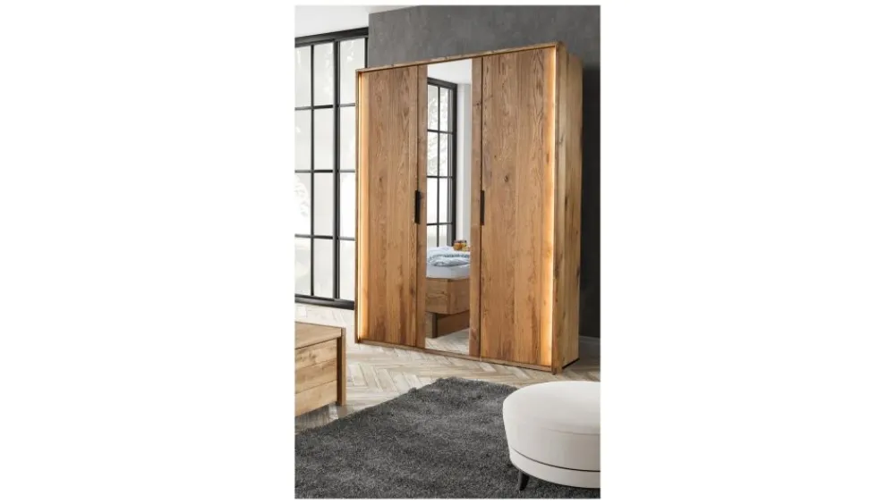Energooszczędne oświetlenie LED to opcjonalne wyposażenie szaf z kolekcji Denver. Dekoracyjne podświetlenie ramy mebla podkreśli ciepły odcień drewna, a także wyjątkowy nastrój wnętrza.