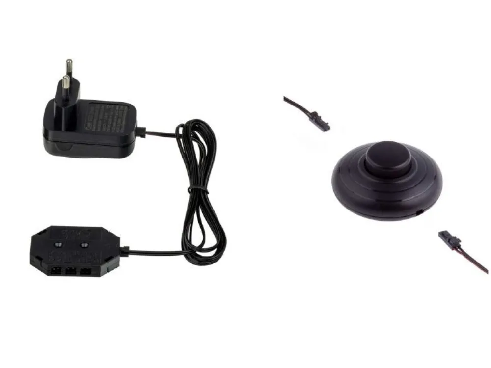 Sieciowy układ zasilająco – sterujący z wyłącznikiem nożnym – rozdzielacz na 6 punktów. Stosowany do listew oświetleniowych Alu 38 cm (L-19), klipsów do półek szklanych (L-21) oraz oświetlenia podszafkowego Square (L10) w wybranych kolekcjach marki Dekort.