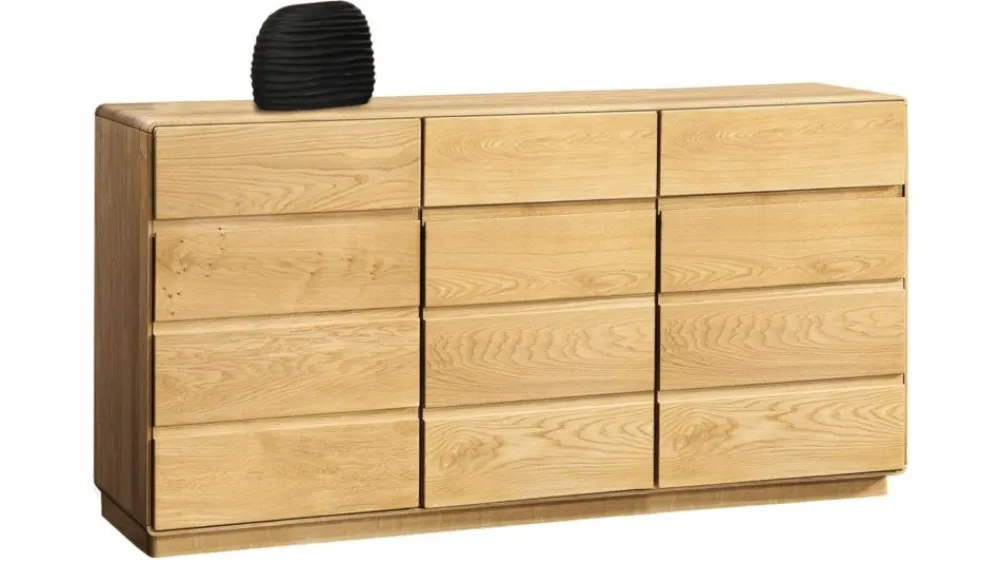 Kolejna propozycja to duża komoda z szafkami i szufladami. Komoda składa się z zestawu szafek zamykanych – są to trzy szafki w dolnej części oraz z zestawu trzech szuflad – panel górny. Jest to uniwersalne rozwiązanie które w idealny sposób łączy zamykane szafki oraz praktyczne i pojemne szuflady. W skład kolekcji wchodzą witryny, komody, szafki RTV, regały, łóżko, stoły oraz krzesła, dzięki temu możemy stworzyć wymarzony zestaw mebli zarówno do salonu, jadalni, biura jaki i sypialni. Kolekcja Atlanta dzięki mnogości brył zdecydowanie jest bardzo uniwersalną propozycją.