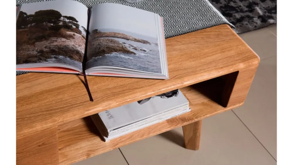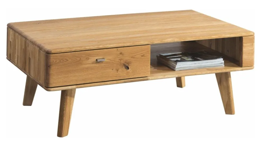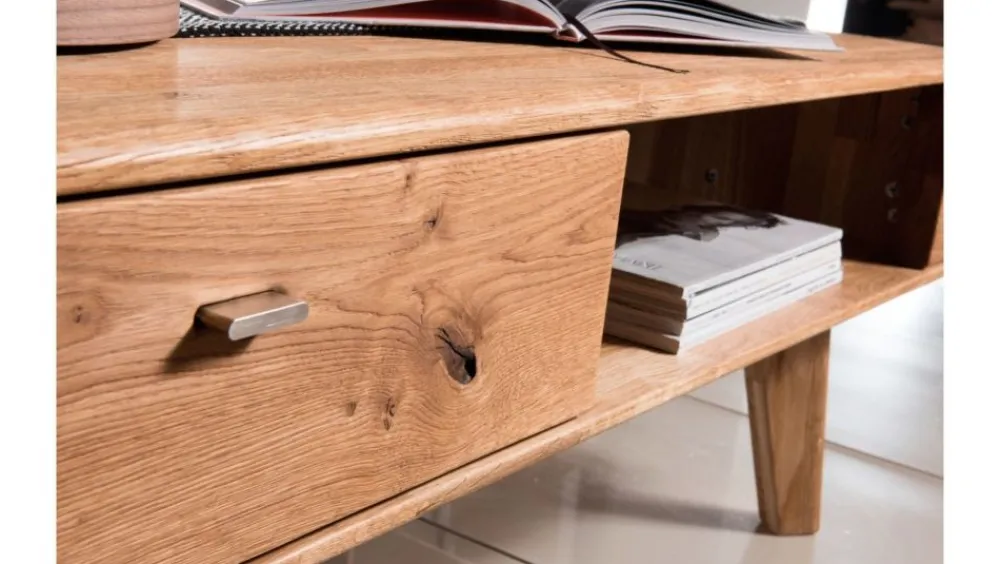 Ławy nie może zabraknąć w żadnym salonie. Każdy musi mieć miejsce na filiżankę z ulubioną kawą lub herbatą. Prezentowany stolik to wersja większa z szufladą i dodatkową wnęką, dostępna jest również wersja mniejsza, która posiada praktyczną szufladę pod blatem. W skład kolekcji wchodzą witryny, komody, szafki RTV oraz krzesła, dzięki temu możemy stworzyć wymarzony zestaw mebli zarówno do salonu, jak i do jadalni.