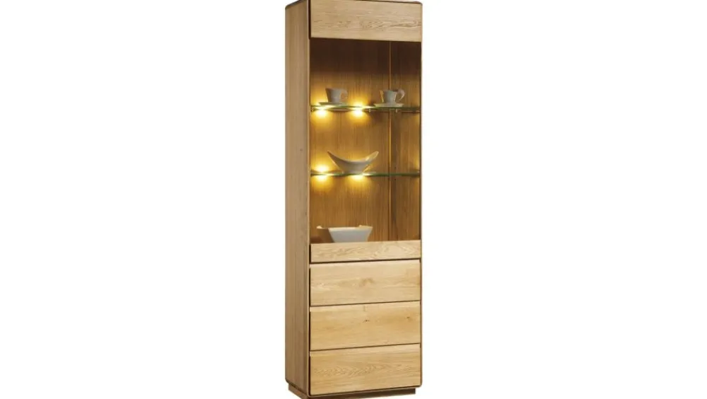 Jedną z propozycji jest witryna wąska – idealna do wyeksponowania zastawy, pamiątek lub ozdób. Prezentowana wersja to opcja węższa. W skład kolekcji wchodzą witryny, komody, szafki RTV, regały, łózko, stoły oraz krzesła, dzięki temu możemy stworzyć wymarzony zestaw mebli zarówno do salonu, jadalni, biura jaki i sypialni. Kolekcja Atlanta dzięki mnogości brył zdecydowanie jest bardzo uniwersalną propozycją.