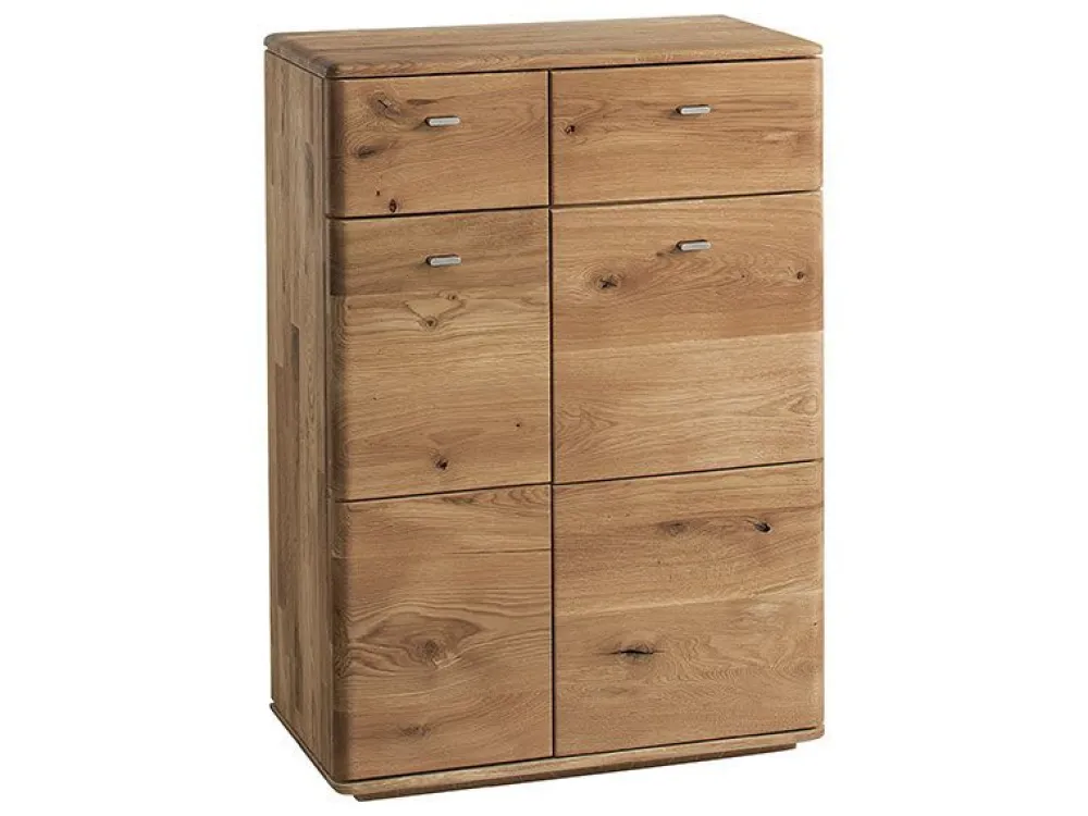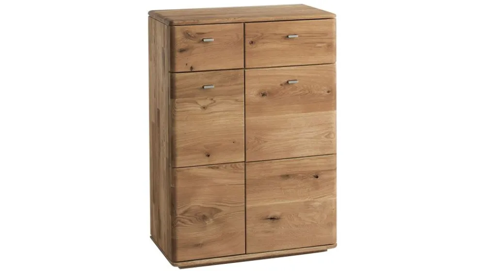 Jedną z propozycji jest duża szafka na buty. Szafa posiada wydzielone miejsce z półkami na obuwie, a także dwie praktyczne szuflady na drobiazgi i akcesoria do pielęgnacji. Szafka jest bardzo pojemna, posiada aż cztery półki na buty. Nadaje się zarówno do ustawienia w garderobie, jak i przedpokoju. Drzwi szafki wykonane są ze szczotkowanego drewna dębowego. Garderoba Denver dostępna jest w naturalnym wybarwieniu dębu sęcznego.