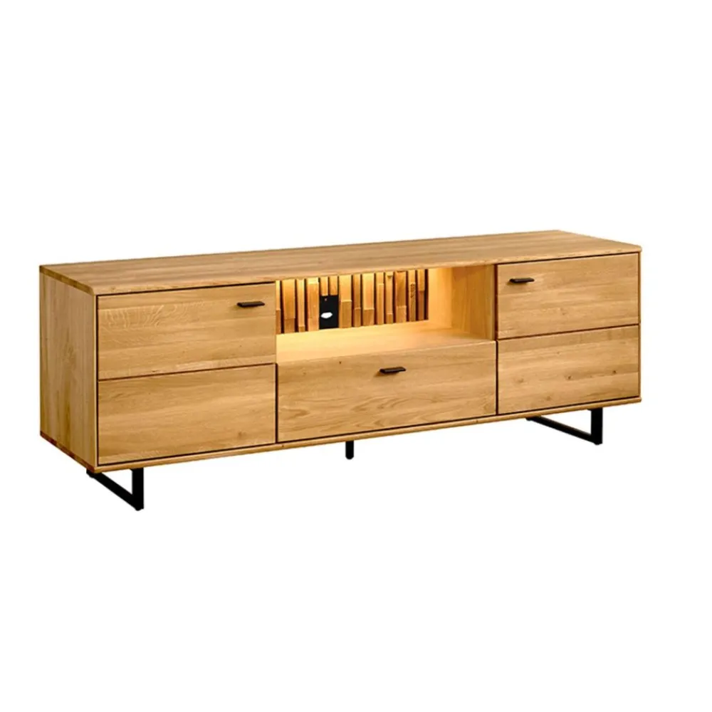 Nowoczesna szafka RTV z drewna Tramonto Typ 26 łączy klasyczne piękno naturalnego dębu z minimalistyczną, nowoczesną formą. Szklane półki oraz subtelne oświetlenie LED nadają jej lekkości i wyjątkowego charakteru. Ozdobne lamele na tylnej ścianie dodają wnętrzu głębi i podkreślają staranność wykonania mebla. Szafka zapewnia odpowiednią przestrzeń na sprzęt RTV, książki, dekoracje oraz codzienne akcesoria. Naturalne drewno sprawia, że każdy egzemplarz jest unikalny, z własnym układem słojów i sęków. To mebel, który łączy nowoczesne wzornictwo z ponadczasową trwałością drewna.