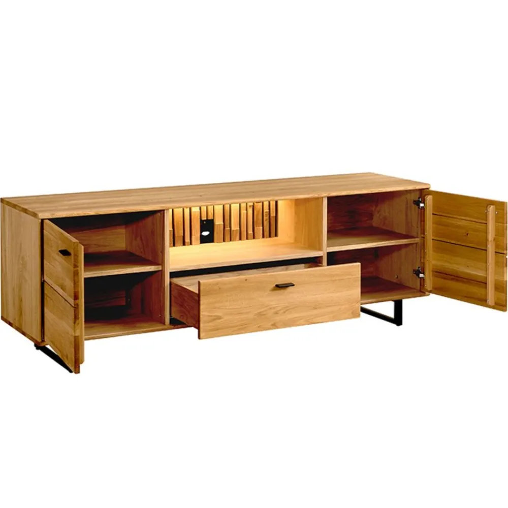 Szafka RTV z litego dębu Tramonto Typ 26 to inwestycja w trwały i funkcjonalny mebel, który zachwyca jakością wykonania. Lite dębowe fronty oraz masywne wieńce nadają jej solidności i podkreślają naturalny charakter drewna. Dzięki precyzyjnemu szczotkowaniu i olejowaniu, drewno zyskuje szlachetny wygląd i jest odporne na codzienne użytkowanie. Szafka RTV z litego dębu doskonale sprawdzi się w roli centralnego punktu salonu, harmonijnie łącząc estetykę i praktyczność. Dekoracyjne lamele w tylnej części mebla to nie tylko ozdoba, ale także element tworzący wyjątkowy klimat wnętrza. To mebel, który wyróżnia się jakością, stylem i naturalnym pięknem.
