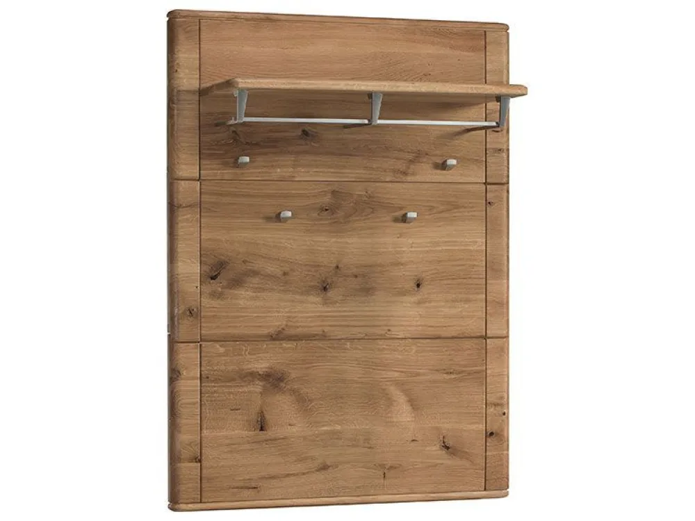 Jedną z propozycji jest panel naścienny z wieszakiem na odzież wierzchnią. Panel wyposażony jest w haczyki do zawieszenia kurtek oraz półkę, pod którą umieszczono drążek na dodatkowe wieszaki. Front panelu wykonano ze szczotkowanego drewna dębowego. Garderoba Denver dostępna jest w naturalnym wybarwieniu dębu sęcznego.