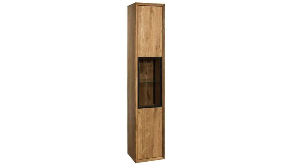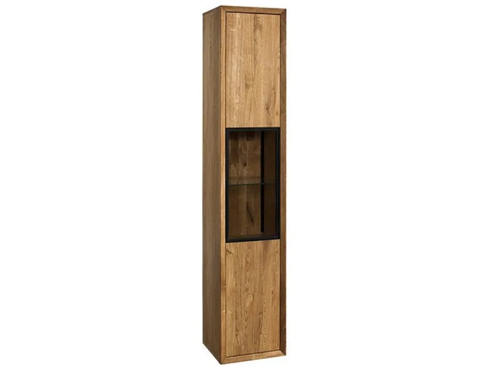 Jedną z propozycji kolekcji Vigo jest witryna wysoka – typu słupek – idealna do wyeksponowania zastawy, pamiątek lub ozdób. Prezentowana wersja to opcja z witryną obejmującą dwie półki, w dolnej części znajduje się dodatkowo zamykana szafka. W ofercie dostępna jest również witryna lewostronna, a także uniwersalny słupek z pełnymi drzwiami. W skład kolekcji wchodzą witryny, komody, szafka RTV, regały oraz stolik, dzięki temu możemy stworzyć wymarzony zestaw mebli zarówno do salonu, jak i jadalni.