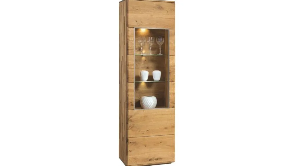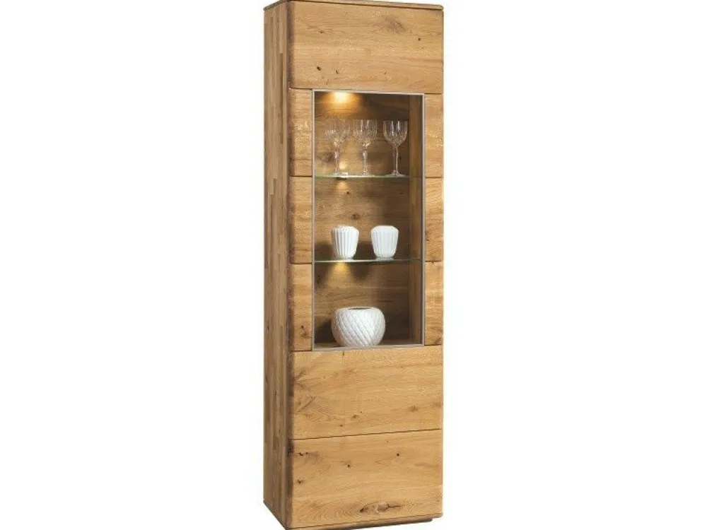 Witryna wysoka to propozycja idealna do salonu lub jadalni. Możemy w niej wyeksponować zastawę, ciekawe rzeźby lub ceramikę. Witryna dostępna w wariancie lewym i prawym, opcjonalnie można zastosować oświetlenie LED (L10). W skład kolekcji wchodzą witryny, komody, szafki RTV oraz krzesła, dzięki temu możemy stworzyć wymarzony zestaw mebli zarówno do salonu, jak i do jadalni.