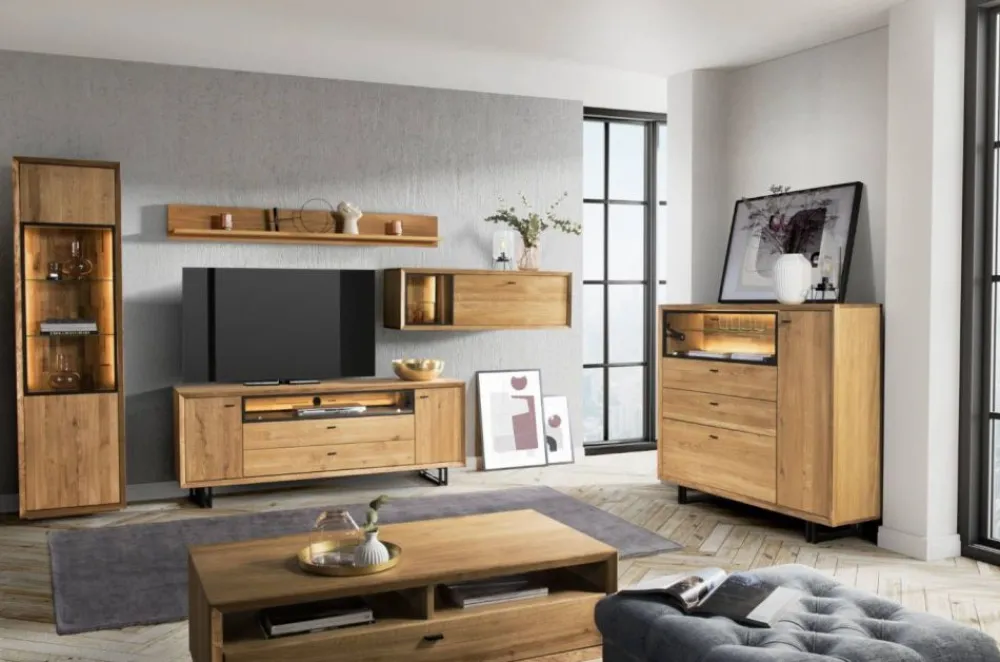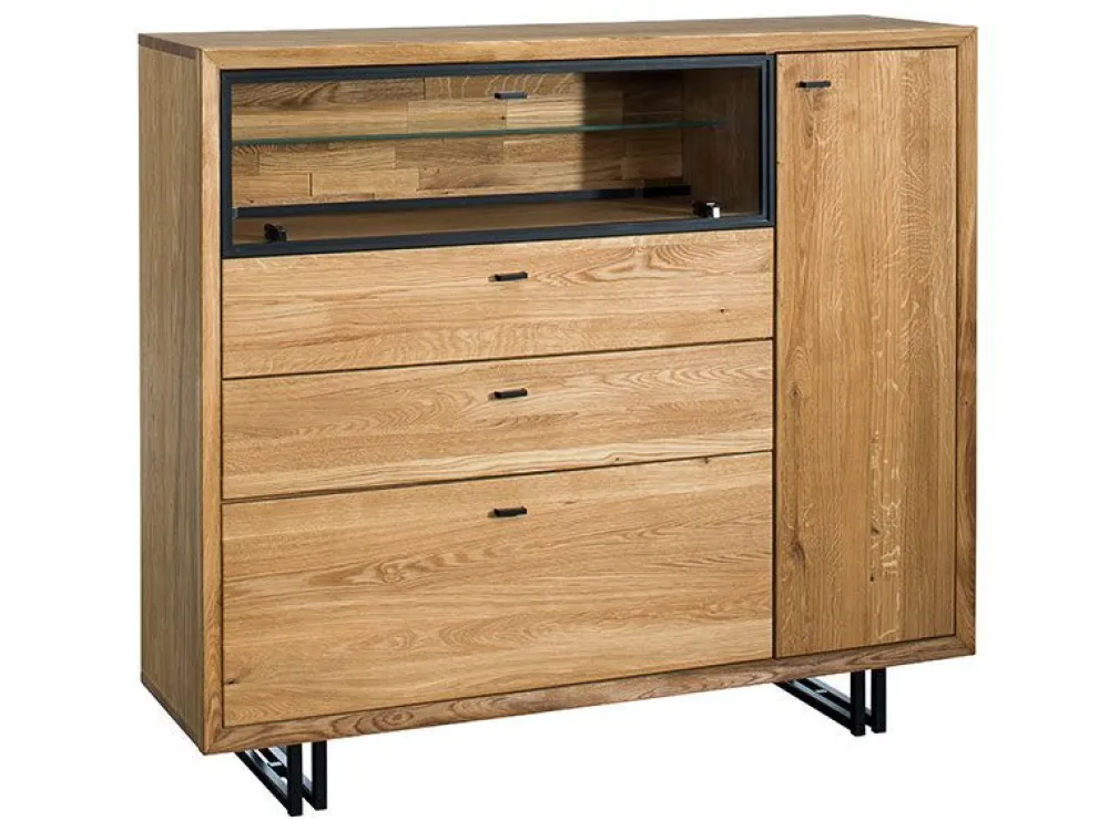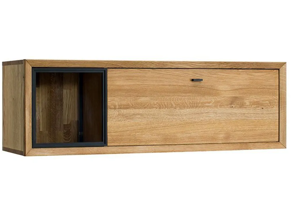 Meble wykonane z połączenia litego drewna i płyty fornirowanej w kolorze dąb natura oraz elementami metalu w kolorze czarnym.