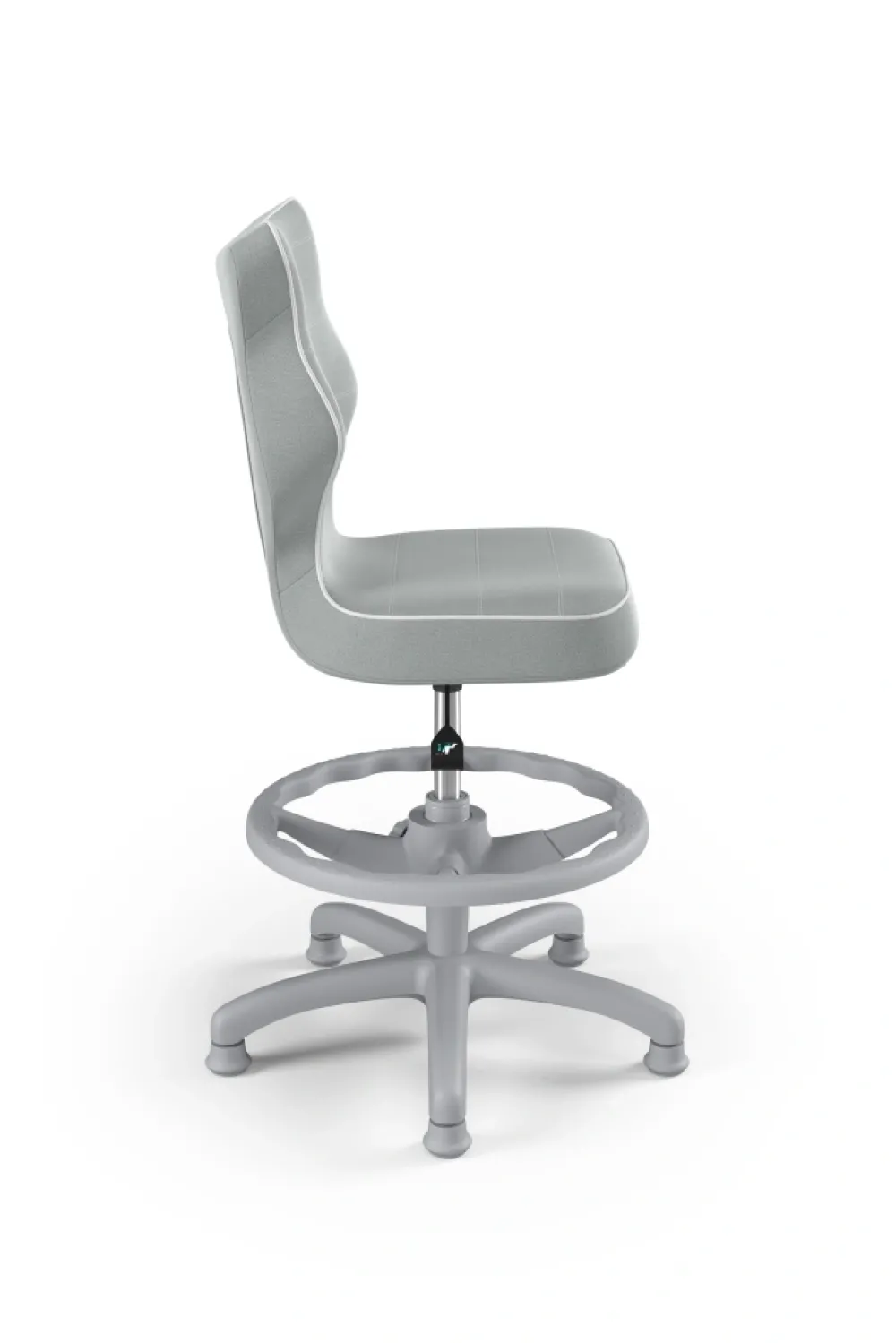Petit to kolekcja krzeseł dziecięco-młodzieżowych o ergonomicznym kształcie siedziska dostosowanym do wzrostu użytkownika. Petit występuje w sześciu rodzajach tkanin, do których został przypisany określony sposób wykończenia krzesła. Model dostępny w czterech rozmiarach i w trzech kolorach komponentów – czarnym, białym oraz szarym. Podstawę krzesła wykonano z tworzywa sztucznego i włókna szklanego. W zestawie znajdują się kółka miękkie umożliwiające ruch krzesła zarówno po powierzchniach twardych jak i wykładzinach. Produkt zaprojektowany i wyprodukowany w Polsce. Wzrost użytkownika, rozmiar 3: 119 – 142 cm Wzrost użytkownika, rozmiar 4: 133 – 159 cm Wzrost użytkownika, rozmiar 5: 146 – 176,5 cm Wzrost użytkownika, rozmiar 6: 159 – 188 cm Wysokość blatu biurka Rozmiar 3-4 – wysokość biurka 63 – 69 cm Rozmiar 5-6 – wysokość biurka 70 – 82 cm Siedzisko: Ergonomiczne siedzisko wykonane z tworzywa sztucznego Mechanizm: Blacha siedziska z dźwignią prostą wykonana ze stali Osłonka: Teleskopowa osłonka na podnośnik gazowy wykonana z tworzywa sztucznego Wersje kolorystyczne: szara Baza: Podstawa pięcioramienna wykonana z tworzywa sztucznego i włókna szklanego Wersje kolorystyczne: szara Kółka: Kółka miękkie wykonane z tworzywa sztucznego, średnica 50 mm, średnica trzpienia fi 11 Wersje kolorystyczne: szara