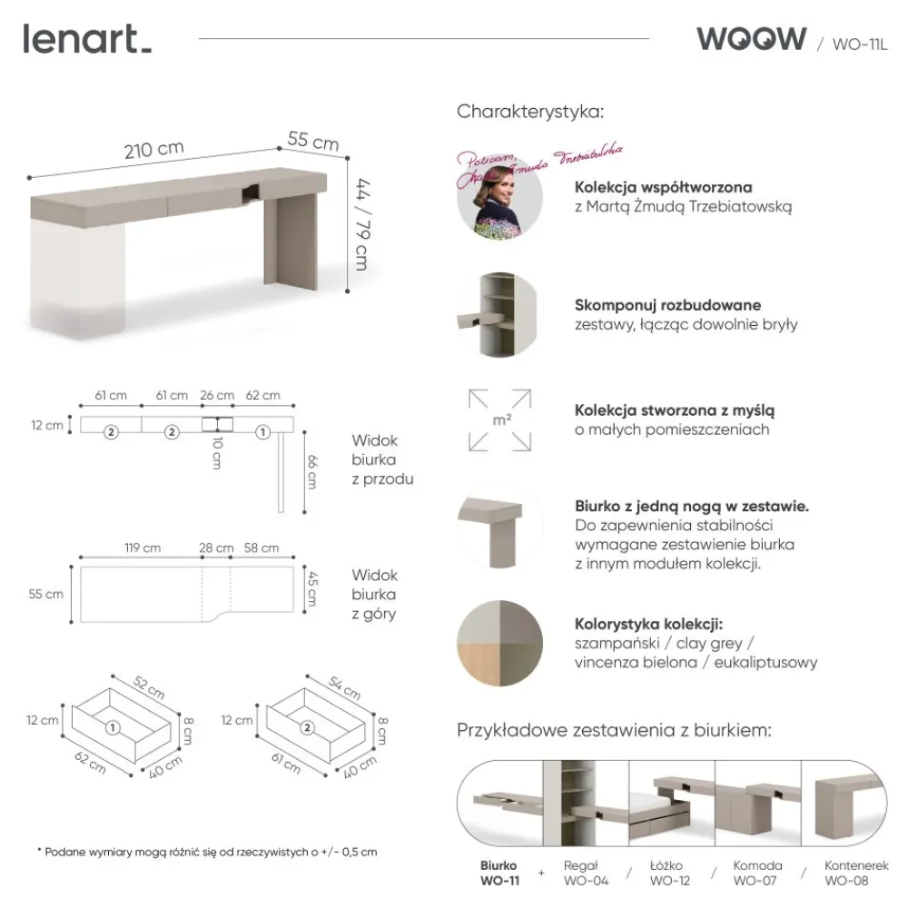 Modułowy charakter biurka WO-11P daje pełną swobodę w aranżacji wnętrza – możesz je dopasować zarówno do mniejszych pokoi, jak i dużych przestrzeni. Biurko idealnie komponuje się z innymi elementami z kolekcji Woow, co pozwala stworzyć kompleksowy zestaw mebli dla nastolatków. Nowoczesne wykończenie w kolorach szampańskim i clay grey nadaje wnętrzu lekkości i stylowego wyrazu. To biurko do pokoju młodzieżowego, które równie dobrze sprawdzi się w strefie nauki, jak i kreatywnego spędzania czasu. Odpowiada na potrzeby uczniów w różnym wieku, dostarczając komfortu i organizacji na co dzień. Jeśli szukasz mebla, który łączy funkcjonalność, styl i trwałość – biurko młodzieżowe WO-11P to idealny wybór.