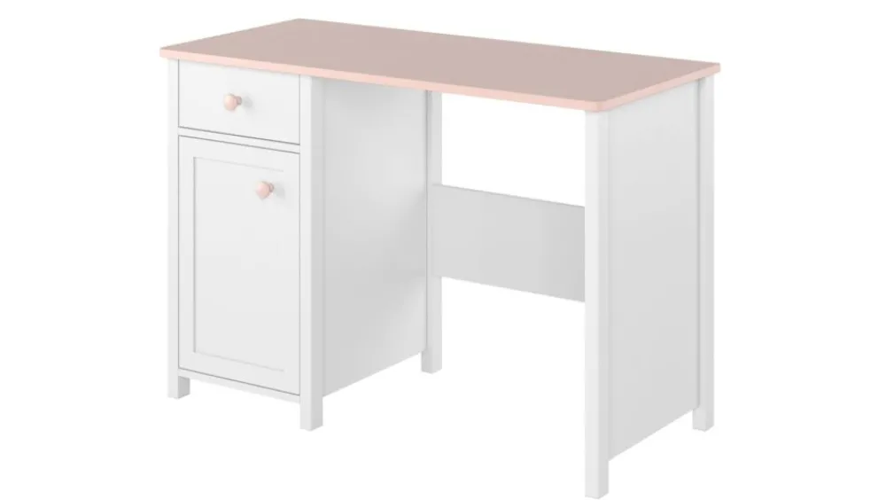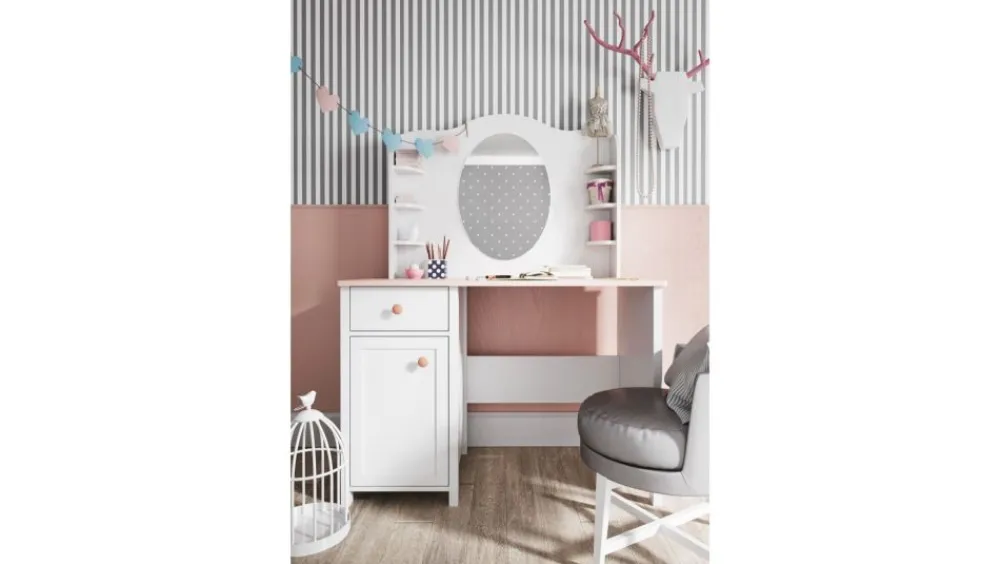 Kolejną propozycją jest klasyczne biurko z dodatkową szafką i szufladą. Mebelek sprawdzi się idealnie przy odrabianiu lekcji lub w czasie twórczych zabaw jak kolorowanie i rysowanie. Idealnym uzupełnieniem są dedykowane nadstawki – jedna to nadstawka, która wyposażona jest w dodatkowe półki i organizery, druga natomiast to propozycja z lustrem, która szybko odmieni biurko w pierwszą toaletkę małej księżniczki.