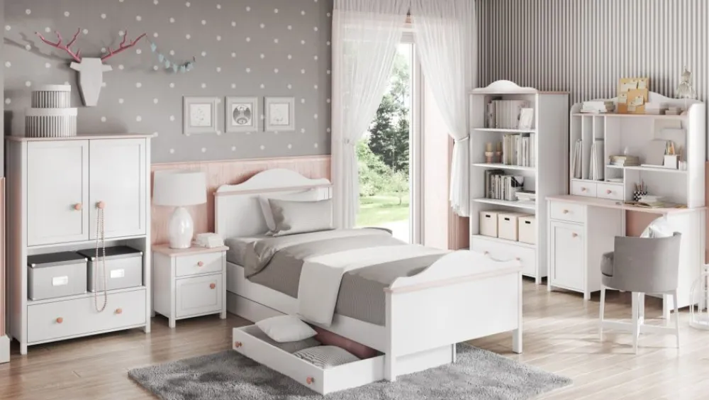 Kolekcja mebli Luna to klasyczna propozycja charakteryzująca się połączeniem bieli z subtelnym, pudrowym różem. Ponadczasowa stylistyka mebli gwarantuje ich użytkowanie od lat dziecięcych do szkolnych. Ogólny styl, różnorodność i funkcjonalność elementów kolekcji zachwyca małe użytkowniczki oraz umożliwia im poczucie się jak prawdziwe księżniczki we własnym pokoju. Największym atutem mebli systemowych jest możliwość tworzenia dowolnych kompletów z gamy dostępnych elementów, dzięki temu jesteśmy w stanie dopasować zestaw adekwatnie do wielkości pokoju oraz wymagań i potrzeb dziecka.