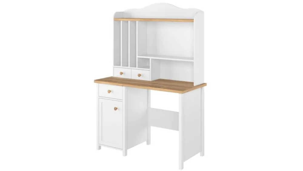 Bardzo ciekawą propozycją kolekcji jest zestaw – Biurko + Nadstawka. Niezwykle funkcjonalna propozycja, która dzięki połączeniu nadaje zupełnie zupełnie inny wymiar – biurko nie wygląda jak zwykły mebelek tego typu. Zestaw możemy traktować jak swojego rodzaju sekretarzyk z dodatkowym miejscem na przybory i dodatki. Dostępne jest również połączenie biurka z nadstawką z lustrem – wtedy tworzy się praktyczna toaletka.