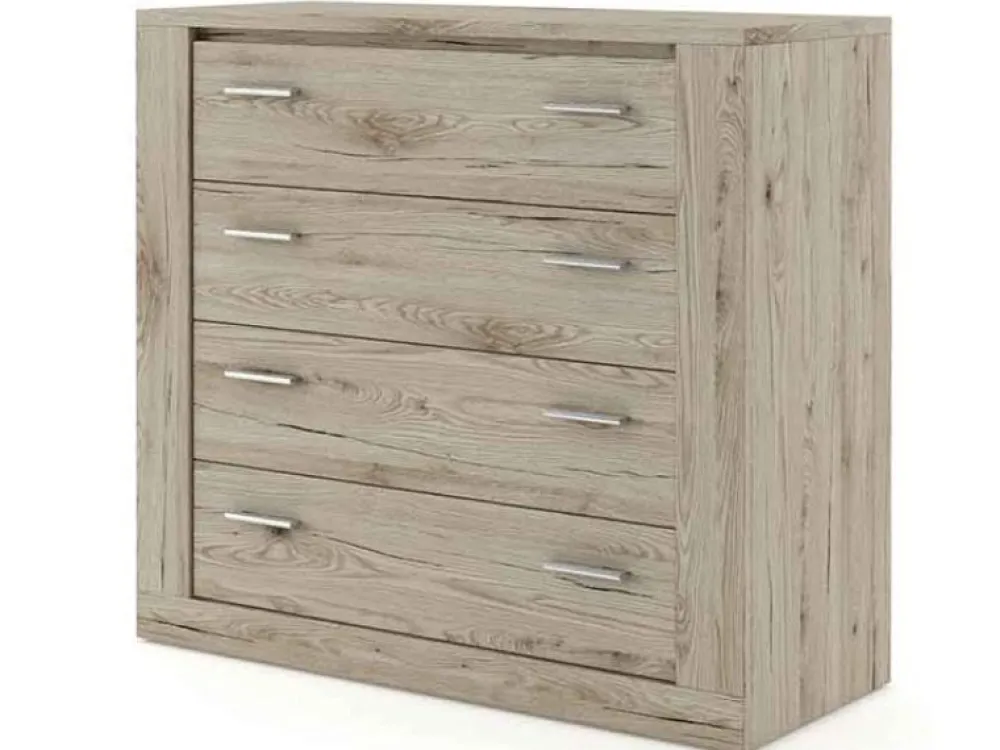 Komoda to niezastąpiony element każdej sypialni. Prezentowana wersja to konfiguracje z czterema pojemnymi szufladami. Takie zestawienie to gwarancja udanej organizacji wszystkich ubrań i rzeczy osobistych.