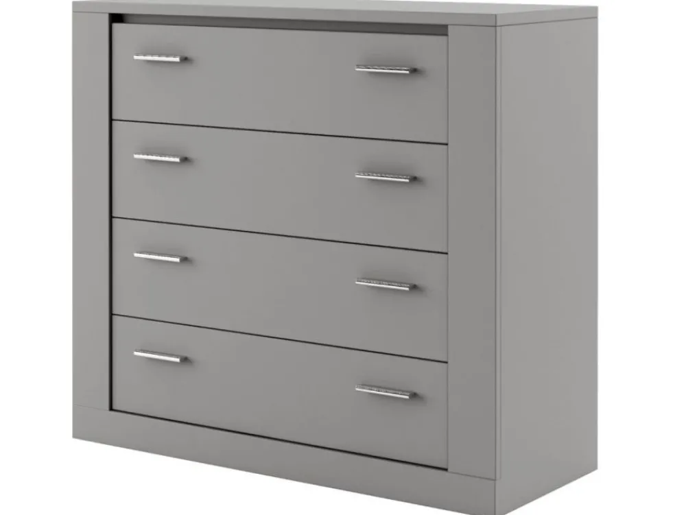 Komoda to niezastąpiony element każdej sypialni. Prezentowana wersja to konfiguracje z czterema pojemnymi szufladami. Takie zestawienie to gwarancja udanej organizacji wszystkich ubrań i rzeczy osobistych.