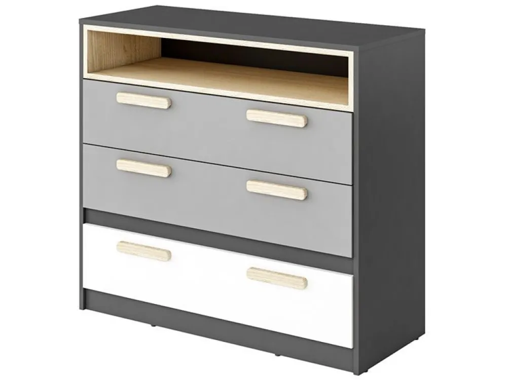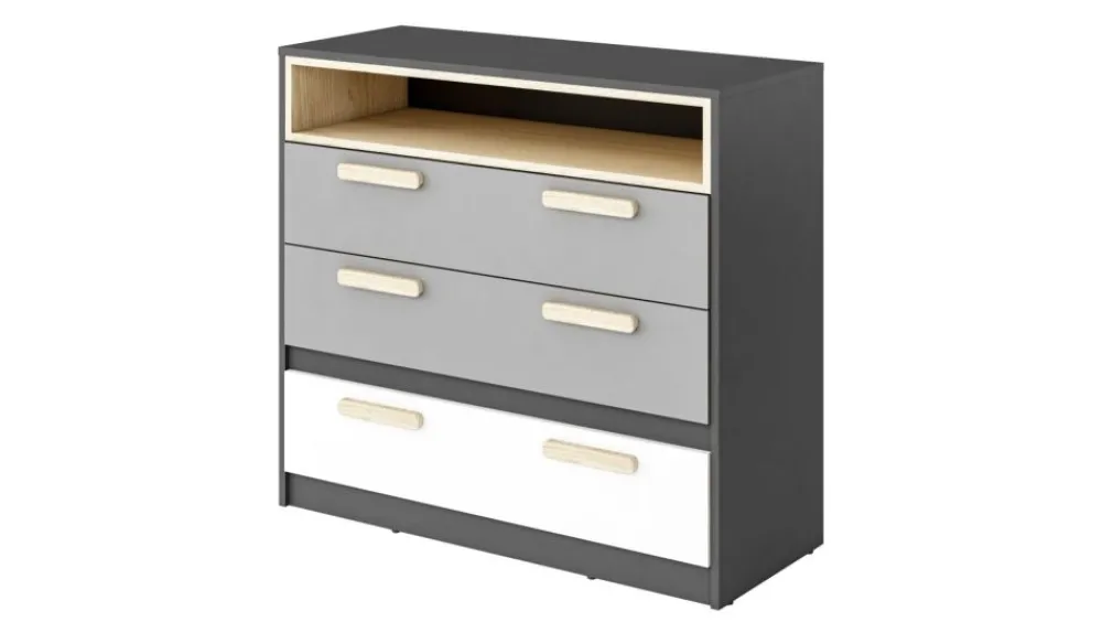 W kolekcji POK znaleźć można mnogość elementów, które dzięki sprytnym rozwiązaniom projektowym doskonale zagospodarują przestrzeń przeznaczoną do przechowania. Jedną z propozycji jest komoda wyposażona w półkę otwartą i trzy szuflady w nieregularnym układzie, nawiązujące stylizacją do całości kolekcji. Dodatkowym jej atutem jest możliwość ustawienia pod ścianą w pomieszczeniu ze skosami. Komoda jest doskonałym uzupełnieniem strefy przechowania i wraz z innymi elementami stworzy zgrany zestaw.