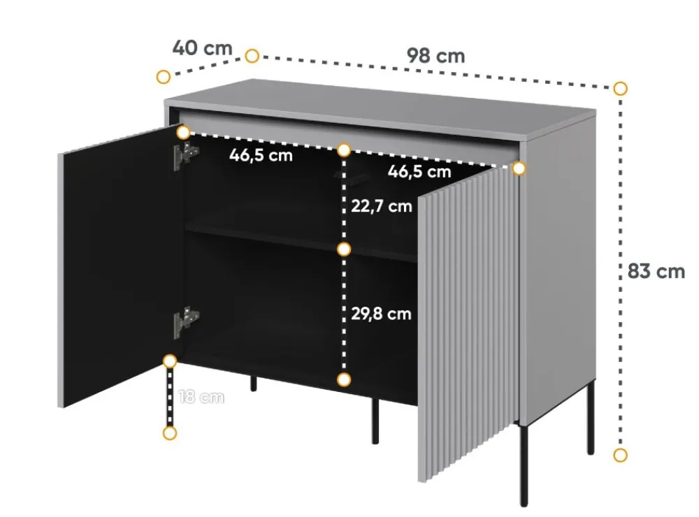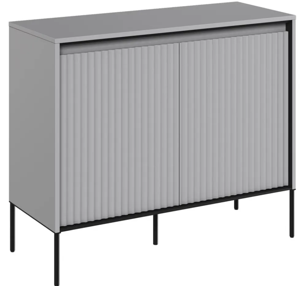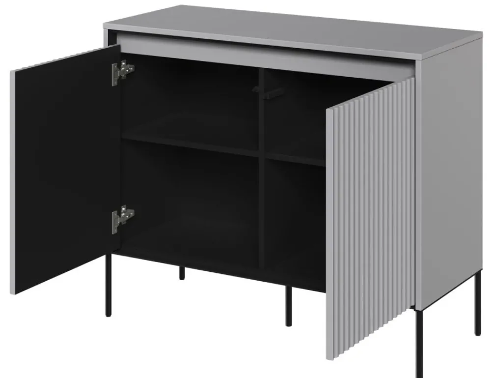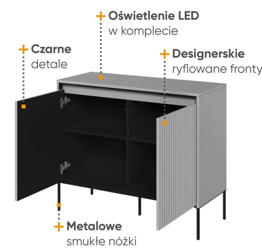 Jednym z unikalnych elementów tej komody są ryflowane fronty, które dodają jej niepowtarzalnego uroku i charakteru. To idealny wybór dla osób, które cenią oryginalny design i chcą dodać tekstury i stylu do swojej przestrzeni. Komoda wsparta jest na kontrastowych czarnych, metalowych nóżkach, które nadają jej stabilności i nowoczesnego wyglądu. Dodatkowo, subtelne podświetlenie frontów w postaci paska ledowego kompleksowo uzupełnia całość.