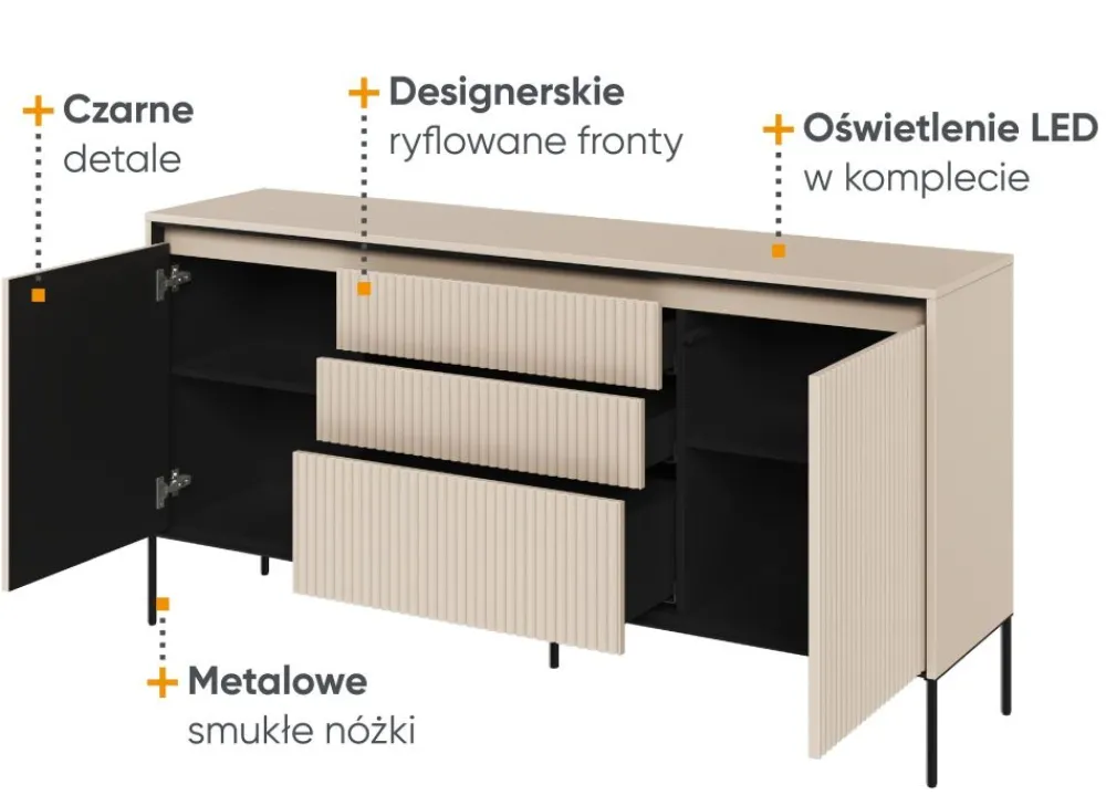 Jeśli pragniesz znaleźć komodę, która łączy funkcjonalność z niezwykłym designem, to mamy dla Ciebie doskonałe rozwiązanie! Komoda TR-01 z kolekcji Trend nie tylko spełni swoją funkcję przechowywania, ale także wzbudzi zainteresowanie swoim unikalnym stylem. Jeden z aspektów, który przyciąga uwagę, to eleganckie ryflowanie frontów, które podkreśla subtelne oświetlenie LED. Ten niezwykły wzór nadaje meblowi wyjątkowy charakter, nadając mu atrakcyjny i oryginalny wygląd. To idealne rozwiązanie, jeśli pragniesz wprowadzić do swojego wnętrza stylowy element, który równocześnie pełni praktyczną funkcję.