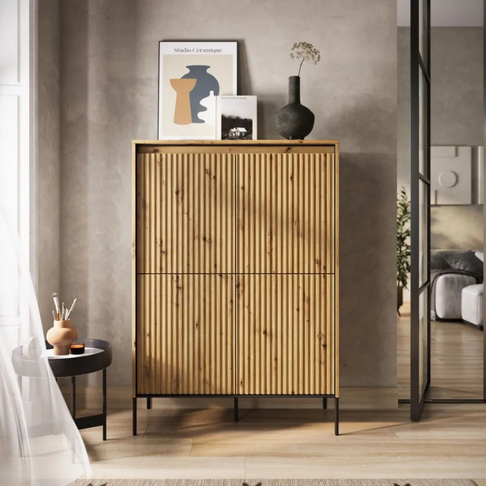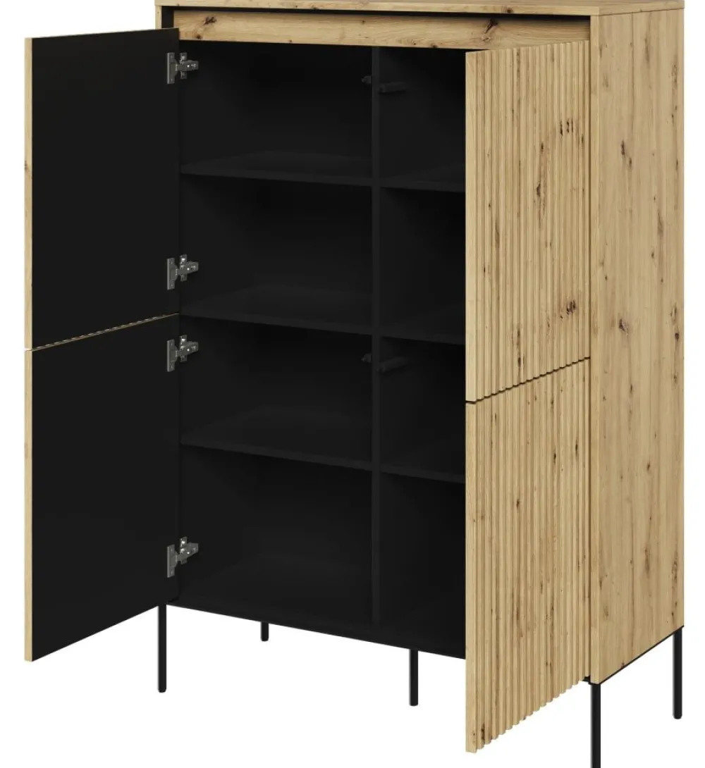 Ta imponująco wysoka komoda oferuje mnóstwo miejsca na przechowywanie różnorodnych przedmiotów na przestronnych półkach. Niezależnie od tego, czy potrzebujesz miejsca na książki, dokumenty, ubrania czy dekoracje, nasza komoda zapewni Ci odpowiednią przestrzeń, aby wszystko było uporządkowane i łatwo dostępne.