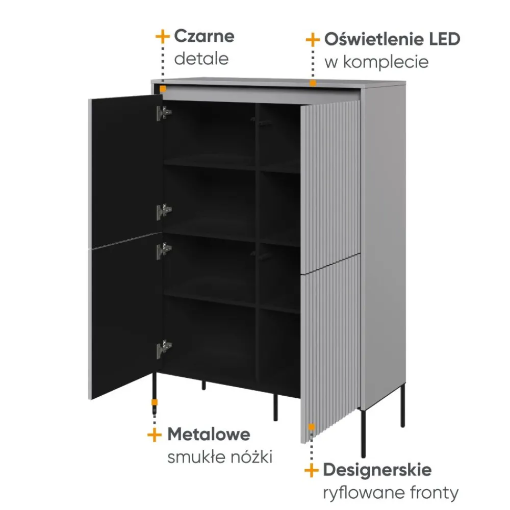 Jednym z unikalnych elementów tej komody są ryflowane fronty, które dodają jej niepowtarzalnego uroku i charakteru. To idealny wybór dla osób, które cenią oryginalny design i chcą dodać tekstury i stylu do swojej przestrzeni. Komoda wsparta jest na kontrastowych czarnych, metalowych nóżkach, które nadają jej stabilności i nowoczesnego wyglądu. Dodatkowo, subtelne podświetlenie frontów w postaci paska ledowego kompleksowo uzupełnia całość.