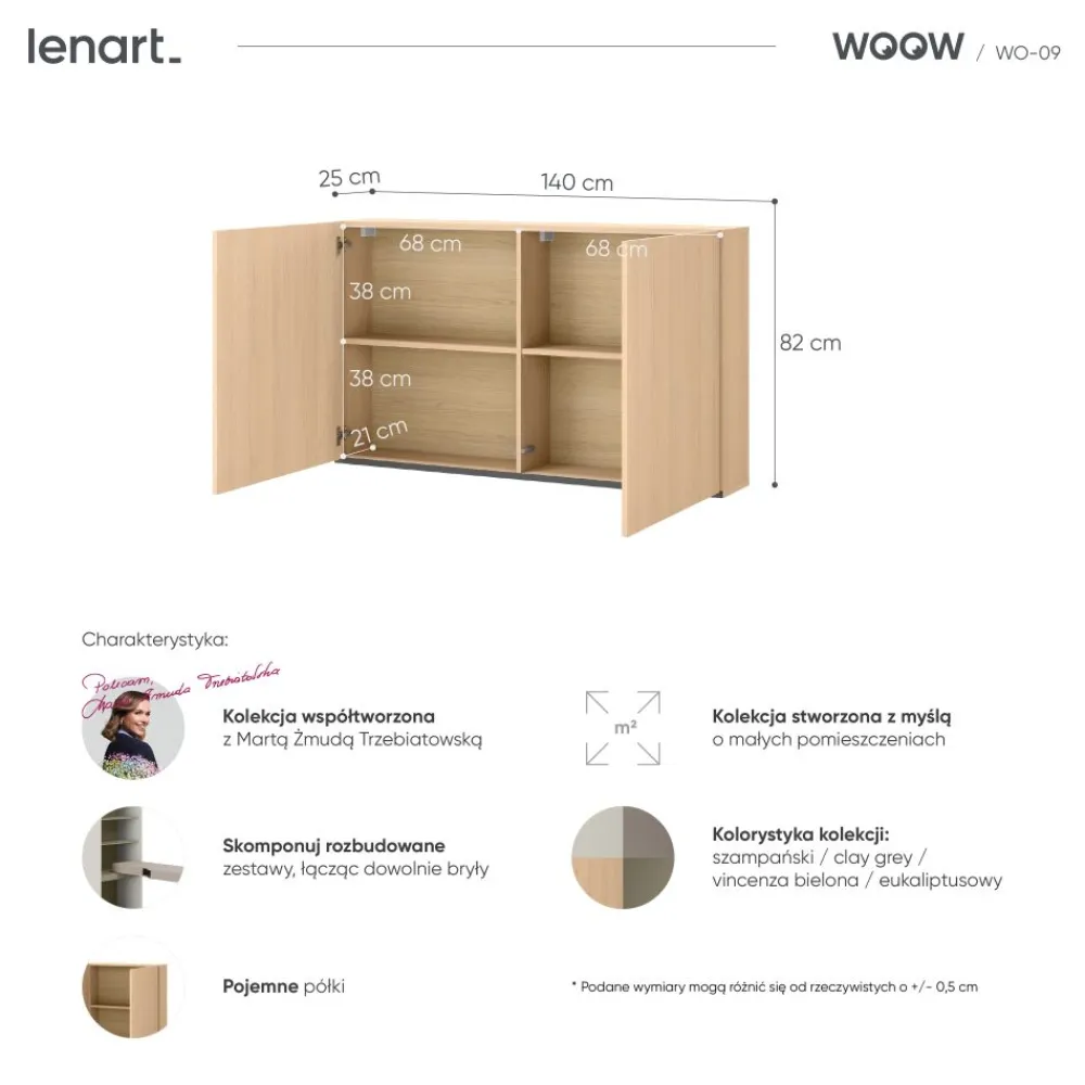 Model WO-09 to nowoczesna szafka na ścianę, która optymalizuje przestrzeń w pionie i nadaje wnętrzu lekkości. Dwa zamykane fronty pozwalają ukryć zawartość, co podkreśla estetykę pomieszczenia i wprowadza wizualny porządek. Montaż nad biurkiem umożliwia wygodne sięganie po niezbędne przedmioty bez zakłócania pracy czy nauki. Szafka zamykana zwiększa bezpieczeństwo przechowywania oraz chroni przed kurzem. Jest kompatybilna z pozostałymi elementami kolekcji Woow, tworząc spójny zestaw mebli do małego pokoju. To doskonała propozycja dla młodych osób, które cenią porządek i funkcjonalność w codziennym życiu.