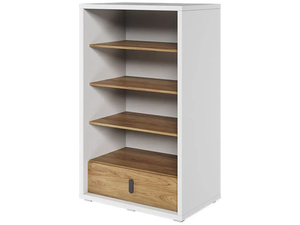 Niski regał z kolekcji SIMI posiada wiele półek i szufladę, dzięki czemu Twoje dziecko wyeksponuje kolekcję książek, bibelotów, ułoży ozdobne koszyki z drobiazgami, a szuflada posłuży na przechowywanie rzeczy, które chcemy po prostu schować.