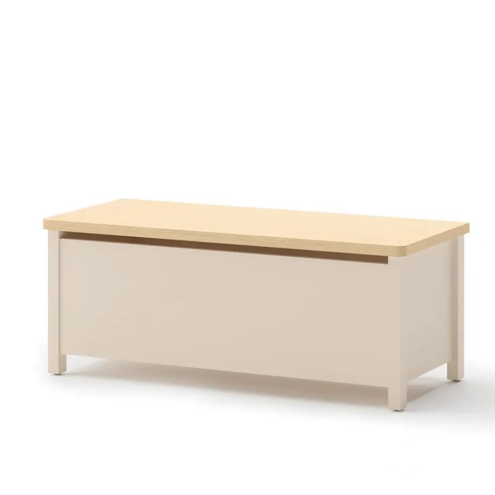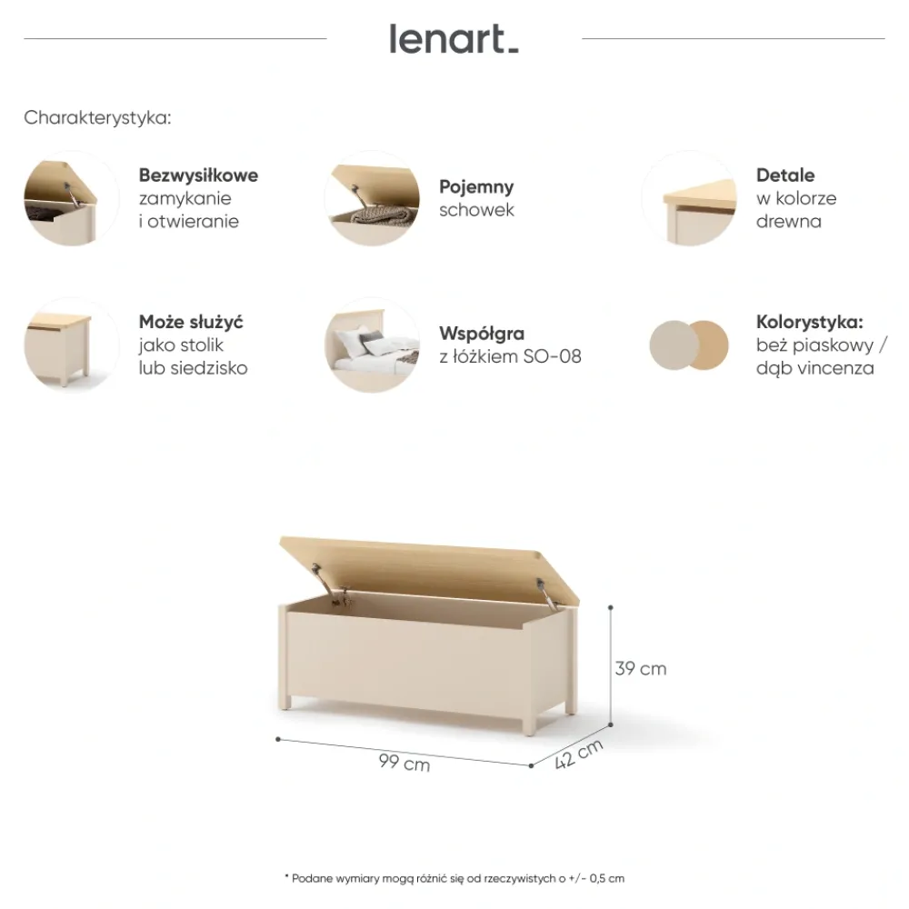 Skrzynia do pokoju dziecka Lenart została wykonana z wytrzymałej płyty laminowanej, wykończonej obrzeżem ABS. Dzięki temu jest odporna na codzienne użytkowanie i zachowuje swój wygląd przez długie lata. To skrzynia na koce, zabawki i pościel, która rośnie razem z dzieckiem i dostosowuje się do jego potrzeb. Solidny blat może być wykorzystywany jako siedzisko, co czyni mebel jeszcze bardziej uniwersalnym. Klasyczne połączenie kolorów beż piaskowy i dąb vincenza bielona nigdy nie wychodzi z mody. To mebel, który sprawdzi się zarówno w dziecięcej sypialni, jak i w pokoju nastolatka. Wybierając skrzynię SO-10, inwestujesz w trwałość, wygodę i ponadczasowy styl.
