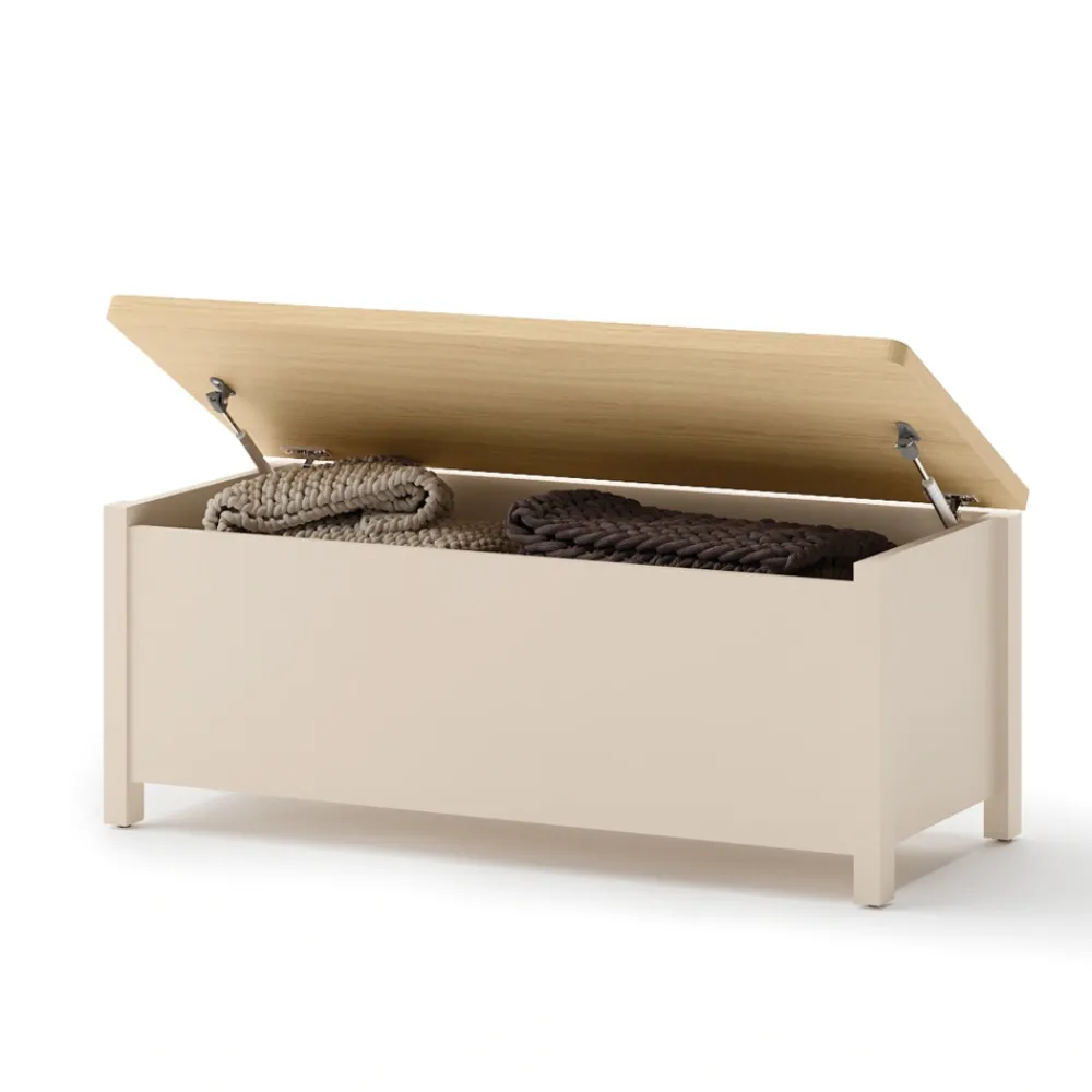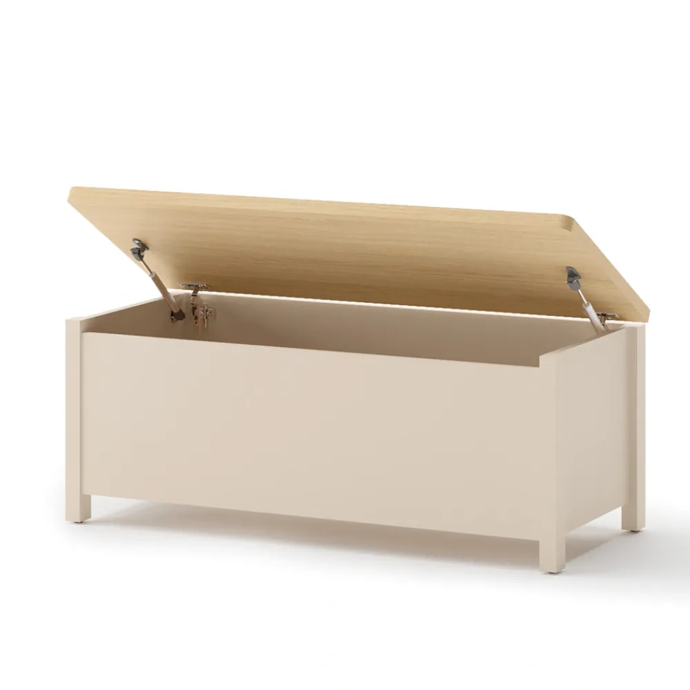 Skrzynia do pokoju dziecka Lenart Story SO-10 to wielofunkcyjny mebel, który łączy praktyczność z elegancją. Wykonana w kolorze beżu piaskowego z dodatkami w dekorze dąb vincenza bielona, doskonale wpisuje się w klasyczne i nowoczesne aranżacje. To skrzynia na pościel, koce lub zabawki, która pomaga utrzymać porządek w dziecięcej przestrzeni. Dzięki solidnemu blatowi może pełnić także funkcję stolika albo dodatkowej ławki do łóżka. Neutralna kolorystyka sprawia, że pasuje zarówno do pokoju dziewczynki, jak i chłopca. To mebel, który nie tylko pełni funkcję użytkową, ale także ozdabia wnętrze. Idealny wybór dla rodziców ceniących harmonię i funkcjonalność.