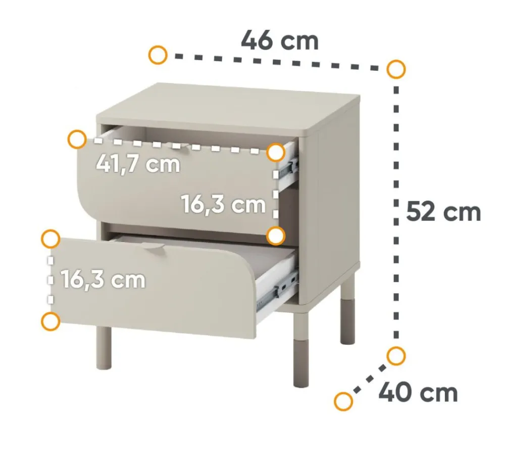 Stolik nocny został specjalnie zaprojektowany z myślą o potrzebach młodszej generacji. Dwie pojemne szuflady pomieszczą wszelkie skarby, jak książki, telefon czy pamiętnik, a na blacie możesz ustawić ulubioną lampkę do czytania. Teraz wszystko będzie na wyciągnięcie ręki, bez konieczności wstawania w nocy. Dzięki temu stolikowi, Twoje dziecko będzie cieszyć się pełnym komfortem i wygodą.