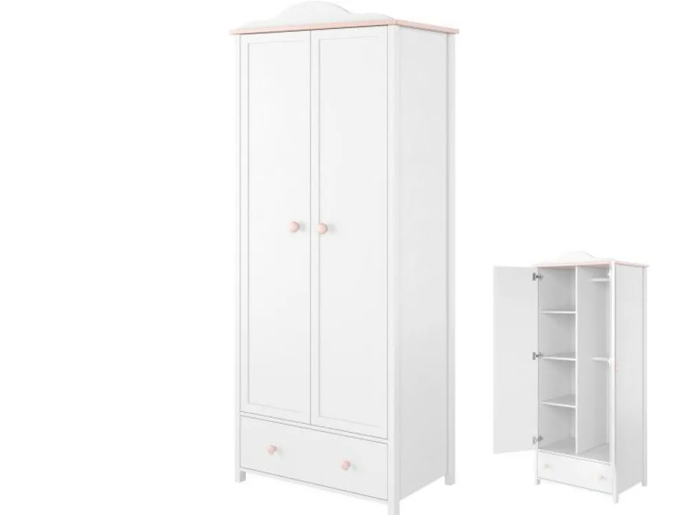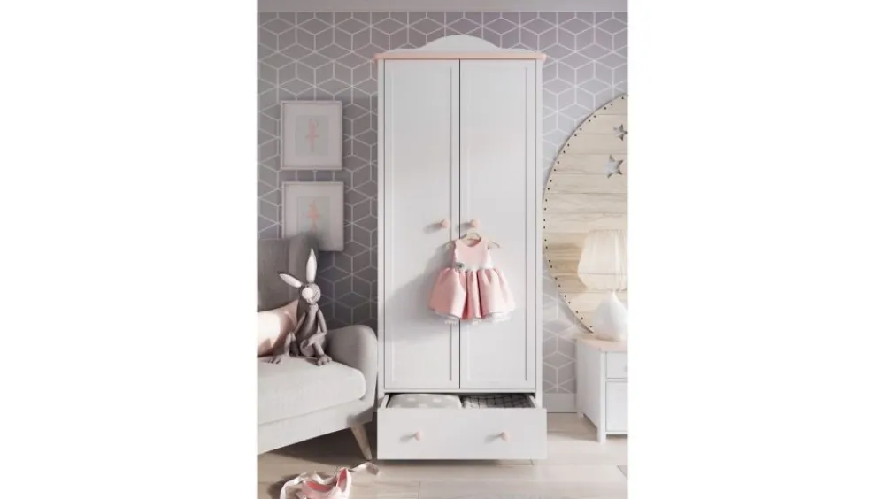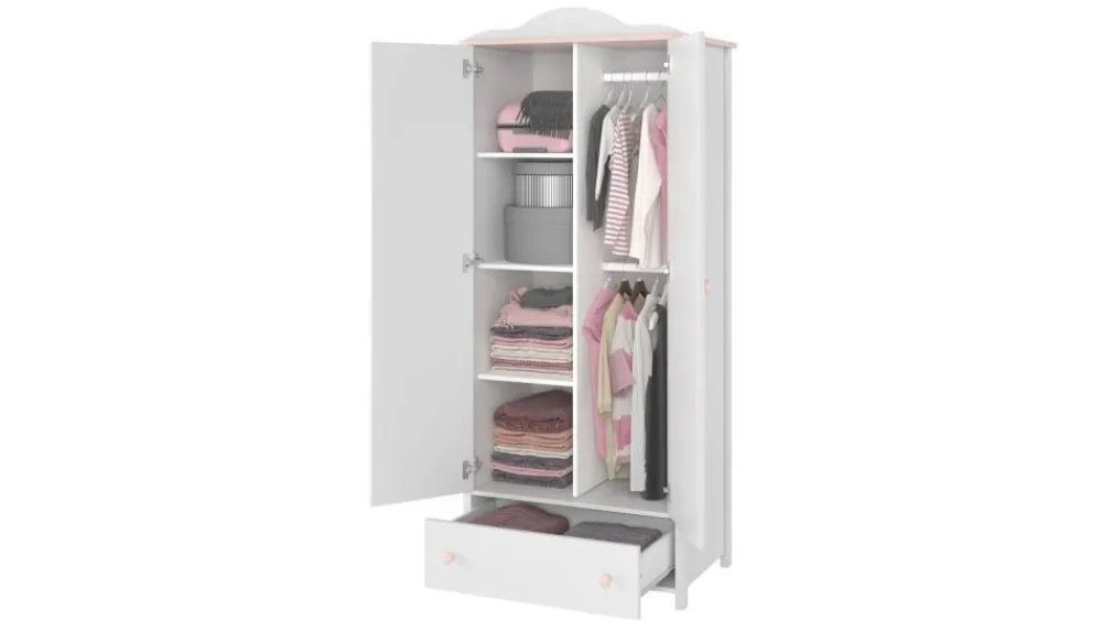 Ważnym elementem kolekcji jest pojemna szafa ubraniowa – wersja z dwoma drążkami na wieszaki oraz 4 półkami w formie regału wewnętrznego. Całości dopełnia pojemna szuflada dolna. Taka konfiguracja z powodzeniem pomieści wszystkie ubranka córki i stworzy swojego rodzaju – mini garderobę.