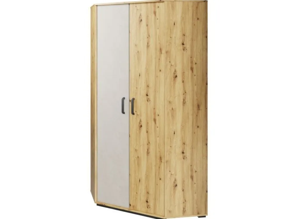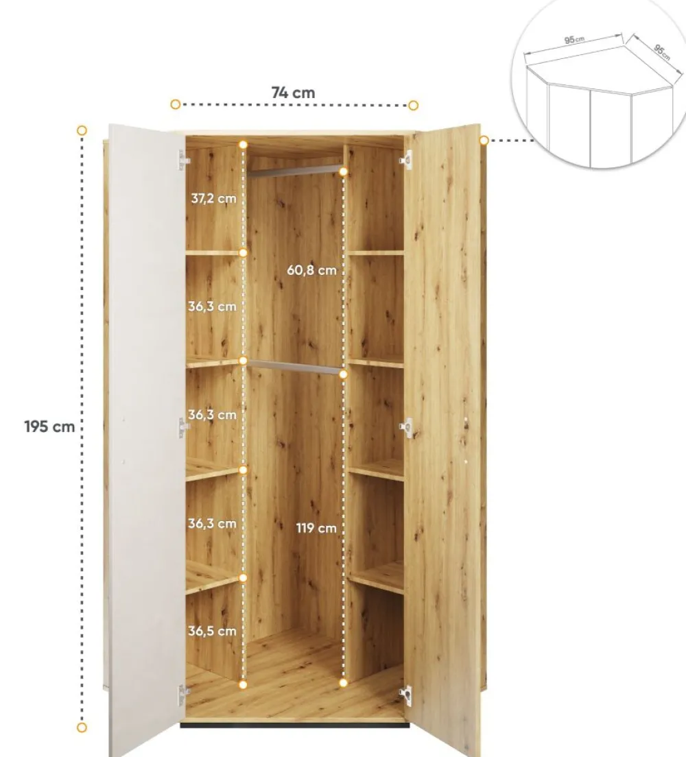 W kolekcji QUBIC znaleźć można kilka wariantów szaf, które dzięki sprytnym rozwiązaniom projektowym doskonale zagospodarują przestrzeń przeznaczoną do przechowania ubrań. Jedną z propozycji jest pojemna szafa narożna. Wnętrze wyposażone jest w dwa drążki i zestaw półek po lewej i prawej stronie, na których pomieścimy na prawdę dużo rzeczy. Szafy narożne od zawsze stanowiły podstawę w praktycznym wykorzystaniu kątów pomieszczenia, tym bardziej, że po dostawieniu do niej innych elementów kolekcji, stworzymy solidną i estetyczną strefę przechowania.