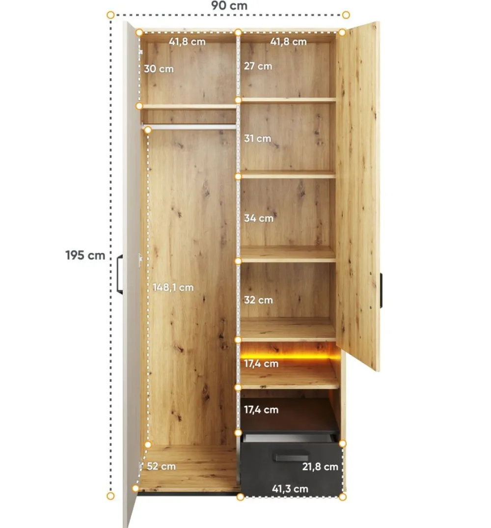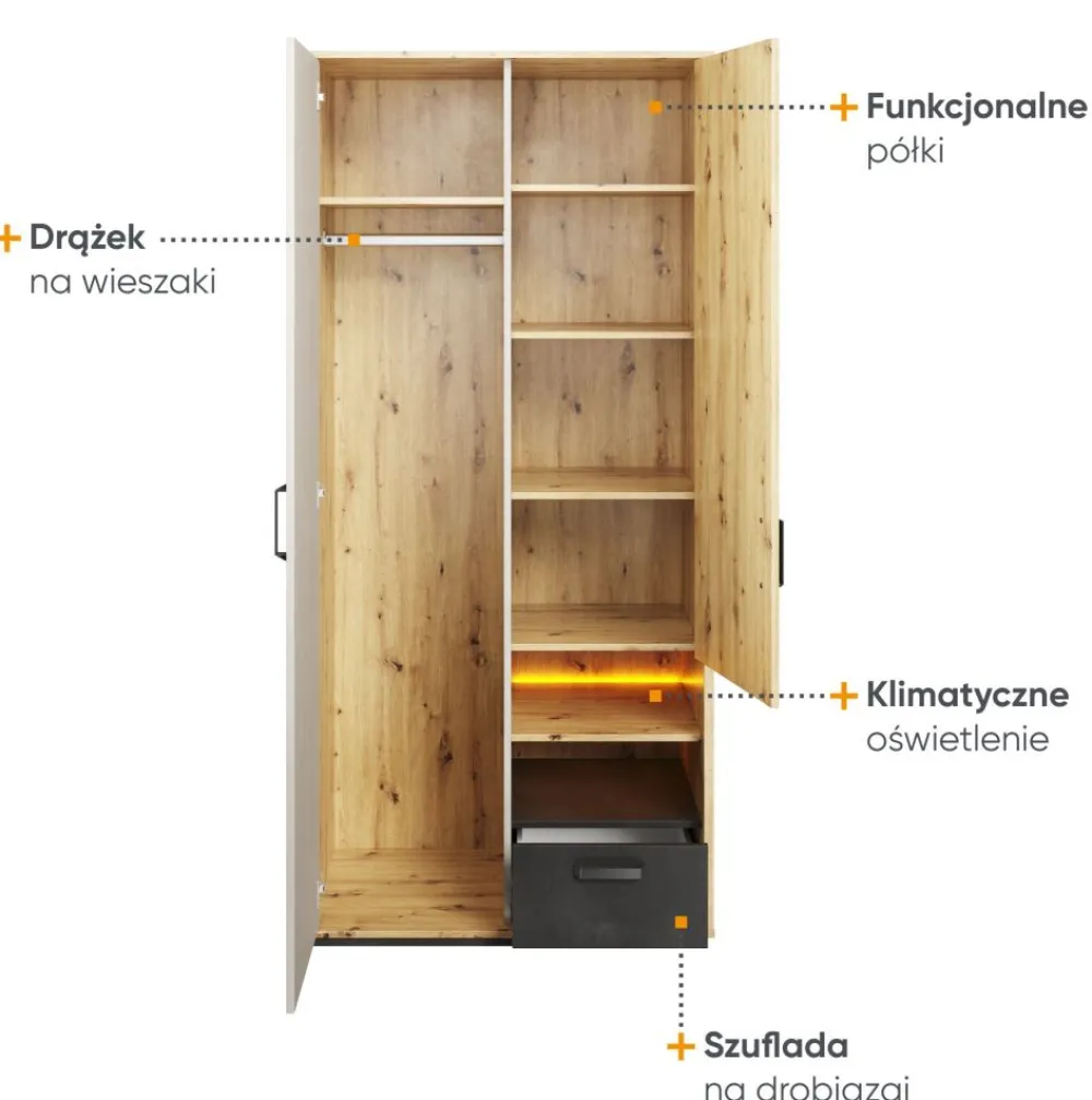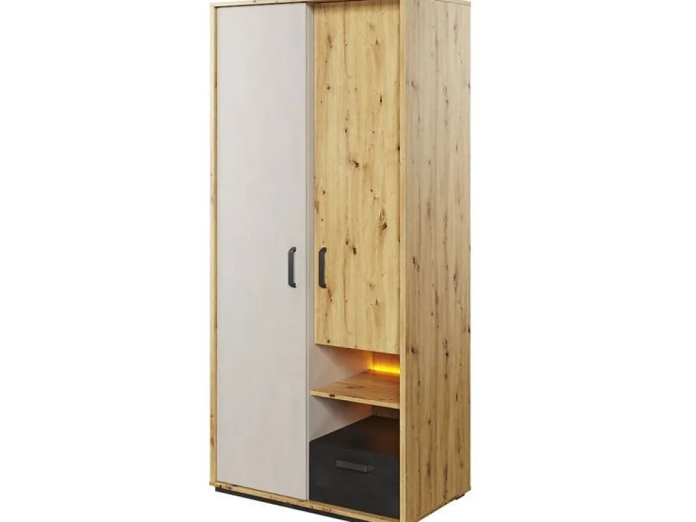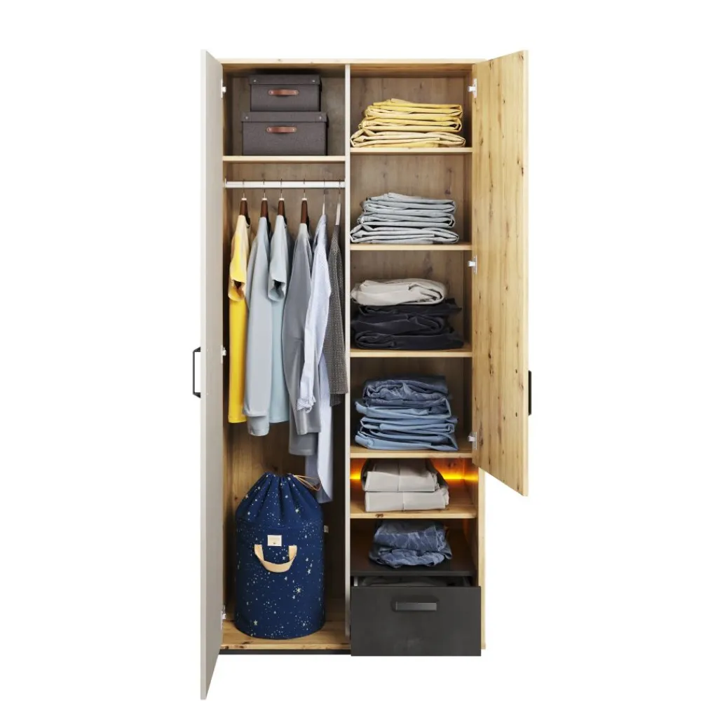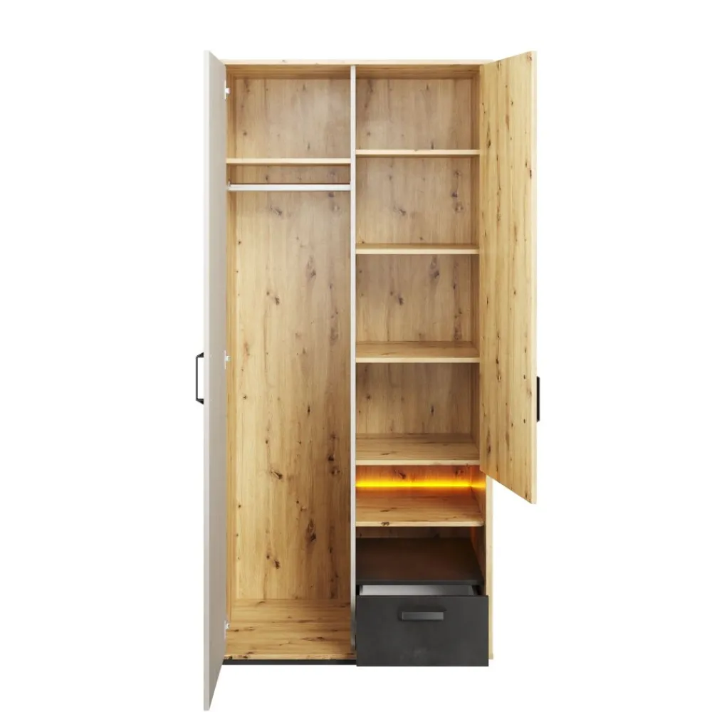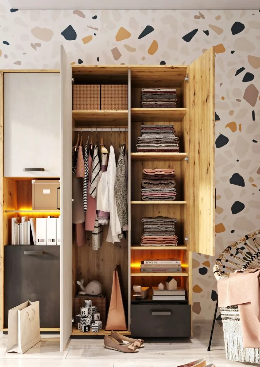 W kolekcji QUBIC znaleźć można kilka wariantów szaf, które dzięki sprytnym rozwiązaniom projektowym doskonale zagospodarują przestrzeń przeznaczoną do przechowania ubrań. Jedną z propozycji jest praktyczna szafa na ubrania, która w praktyczny sposób łączy półki na ubrania, przestrzeń na wieszaki z ubraniami, wnęki bez frontu i praktyczną szufladę. Aż ciężko uwierzyć, że te wszystkie funkcje ma jeden mebel. Całości dopełnia subtelne oświetlenie LED.