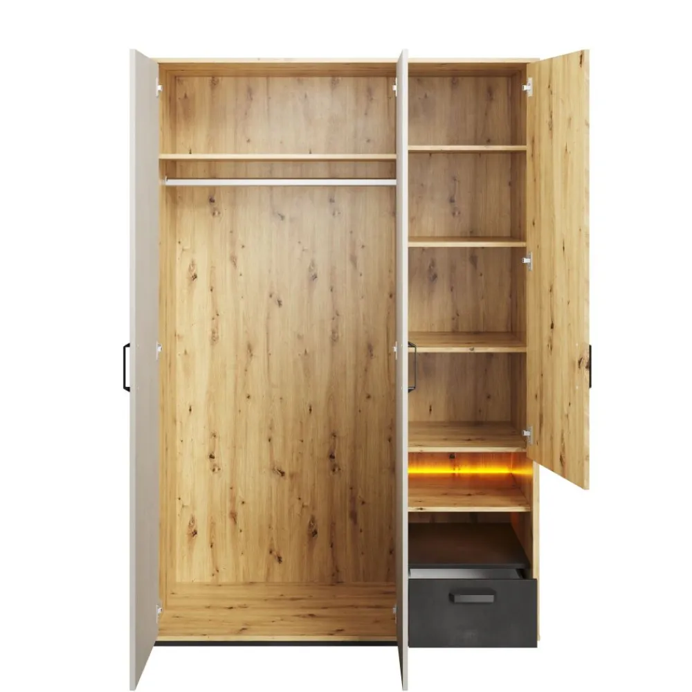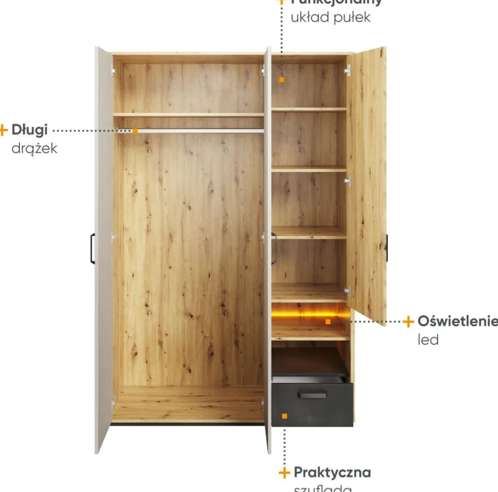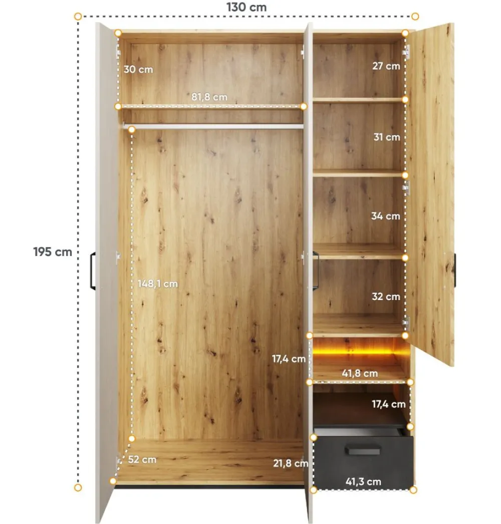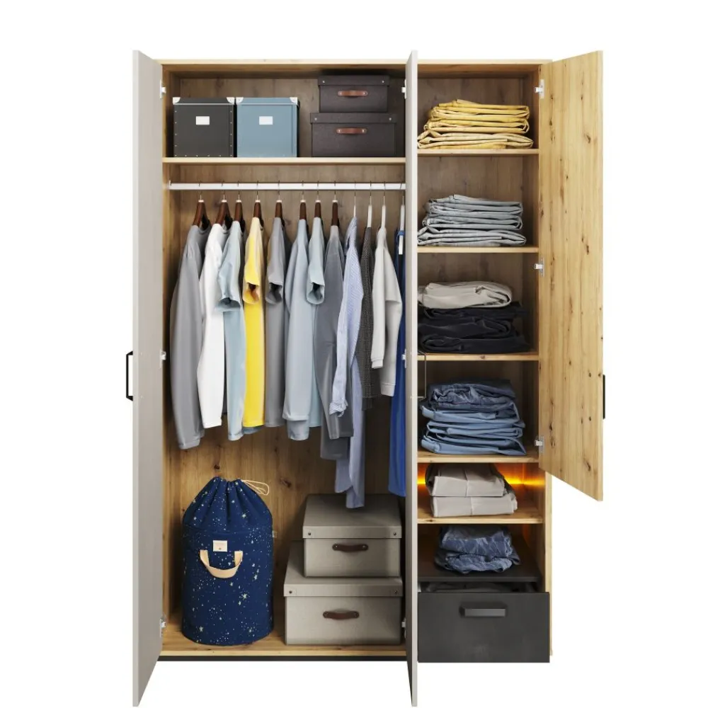 W kolekcji QUBIC znaleźć można kilka wariantów szaf, które dzięki sprytnym rozwiązaniom projektowym doskonale zagospodarują przestrzeń przeznaczoną do przechowania ubrań. Jedną z propozycji jest szeroka szafa na ubrania z subtelnym podświetleniem we wnęce. Po lewej stronie znajduje się drążek na ubrania oraz górna półka. Prawa część za frontem skrywa 4 pojemne półki. Uzupełnieniem jest wspomniana już wnęka i dodatkowa szuflada.