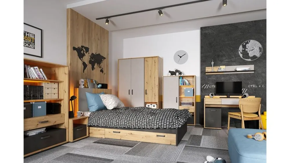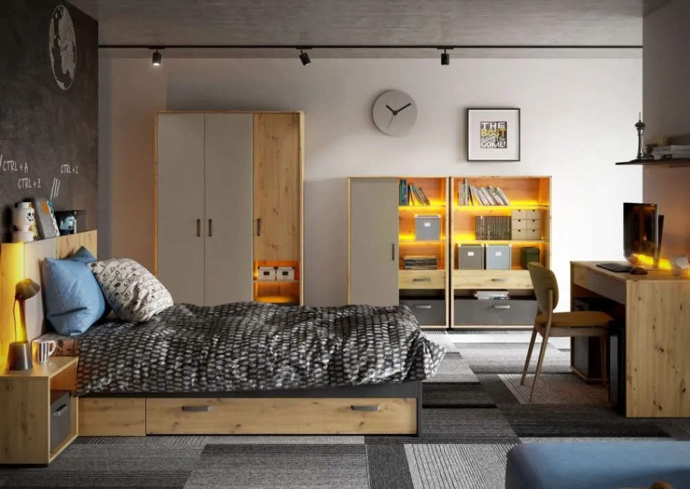 Kolekcja Qubic zdecydowanie należy do nowoczesnych propozycji, głównie dzięki zastosowaniu ciekawego zestawienia kolorystycznego. Drewnopodobny dekor w połączeniu z subtelną szarością ciekawie kontrastuje z ciemniejszymi wstawkami w kolorze surowej stali. Połączenie kolorów jest niezwykle uniwersalne, przez co kolekcja sprawdzi się zarówno w pokoju dziewcząt jak i chłopców. W większości elementów zastosowano oświetlenie Led w kolorze pomarańczowym, które dodaje energii i tworzy niepowtarzalny klimat.
