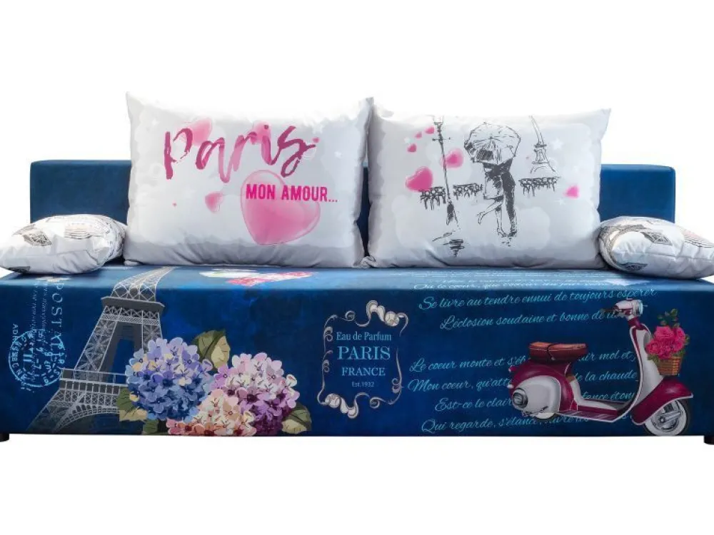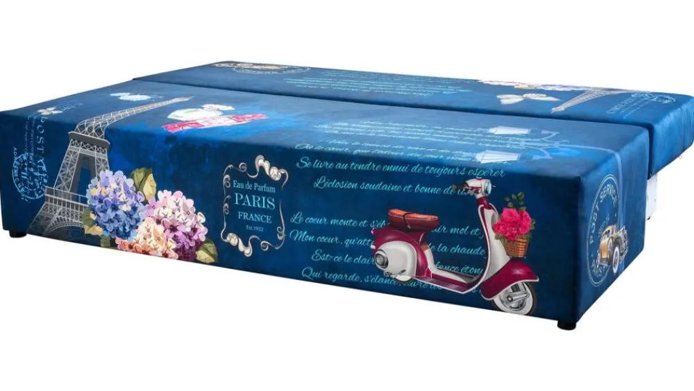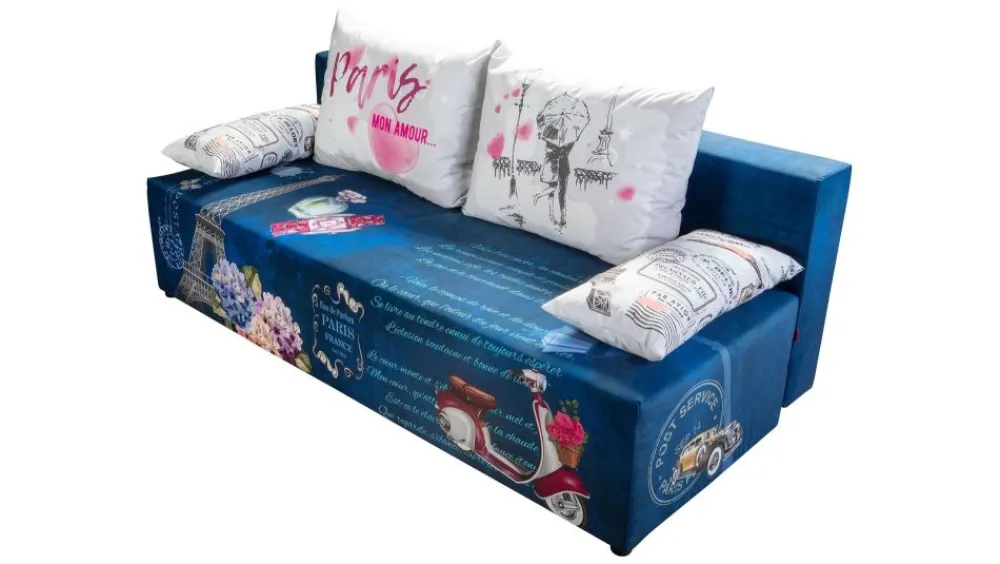 Model France to model dla miłośników francuskiego stylu. Tkanina na sofie zawiera grafiki charakterystyczne dla tego kraju. Tkanina jest gładka w dotyku i specjalnie przeznaczona do precyzyjnego nadruku, dzięki czemu mebel jest najwyższej jakości.