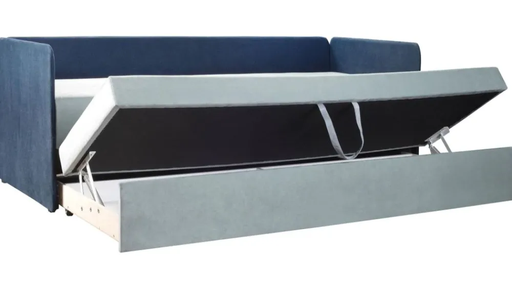 Tapczan POLO został stworzony aby zapewnić komfortowy sen i wypoczynek. Największym atutem mebla są dwa miejsca do spania oraz spory pojemnik na pościel. Wnętrze pojemnika wykończone jest estetyczną, białą płytą laminowaną. Mechanizm otwierania wyposażony w automat wspomagający otwieranie.