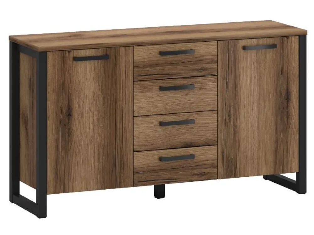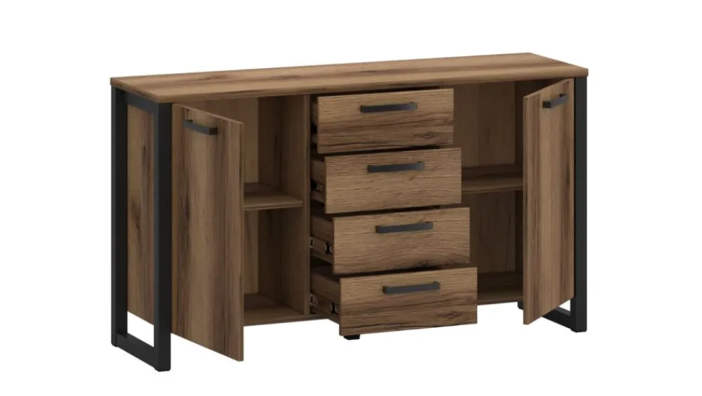Komoda do sypialni lub komoda do salonu, to jedne z wielu możliwości, gdzie doskonale sprawdzi Ci się komoda z serii Mares. Uniwersalna ciemna kolorystyka oraz czarne loftowe nóżki, a dopełnieniem całej stylistyki są również czarne uchwyty. Mebel posiada drzwiczki po prawej i lewej stronie za którymi kryją się półki oraz cztery, centralnie na środku umieszczone szuflady. Dzięki tak rozplanowanej przestrzeni lepiej możesz segregować przechowywane w komodzie przedmioty, takie jak ubrania, bieliznę, pościel, obrusy czy też przedmioty codziennego użytku. Kolorystyka, na bazie której została oparta kolekcja Mares wpasuje się w każde pomieszczenie, tworząc niebanalną kompozycję.