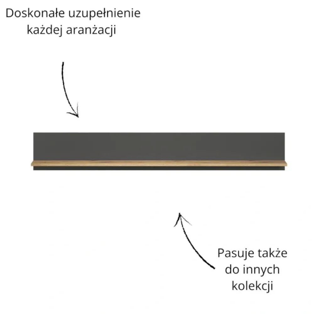 Półka oferuje przestrzeń do przechowywania i eksponowania niezbędnych przedmiotów, zachowując jednocześnie porządek i estetykę wnętrza. Stabilna konstrukcja z laminowanej płyty meblowej pozwala na bezpieczne użytkowanie i swobodne rozmieszczanie dekoracji. Dzięki połączeniu naturalnego odcienia dębu evok z grafitem, półka świetnie komponuje się z innymi meblami w mieszkaniu, dodając mu spójności. Produkt dostarczany jest w paczce do samodzielnego montażu, co pozwala na szybkie i bezproblemowe zawieszenie. To rozwiązanie idealne, jeśli chcesz uporządkować przestrzeń i dodać jej eleganckiego wyrazu.