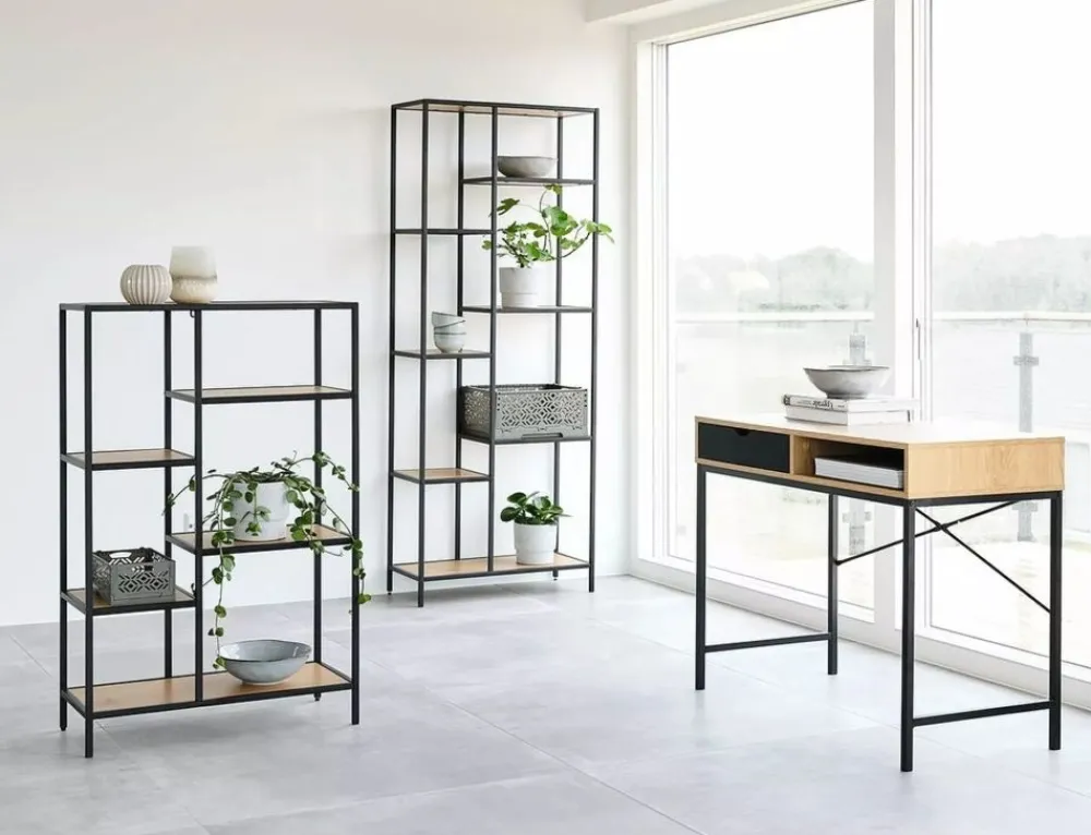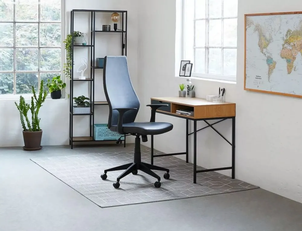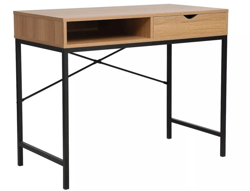 Biurko, blat: płyta laminowana, stelaż: metal, kolor: dąb / czarny mat. Wysokość szuflady 10cm.