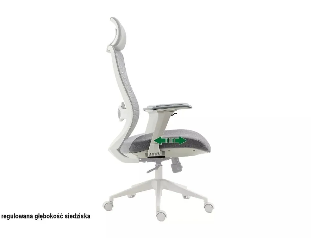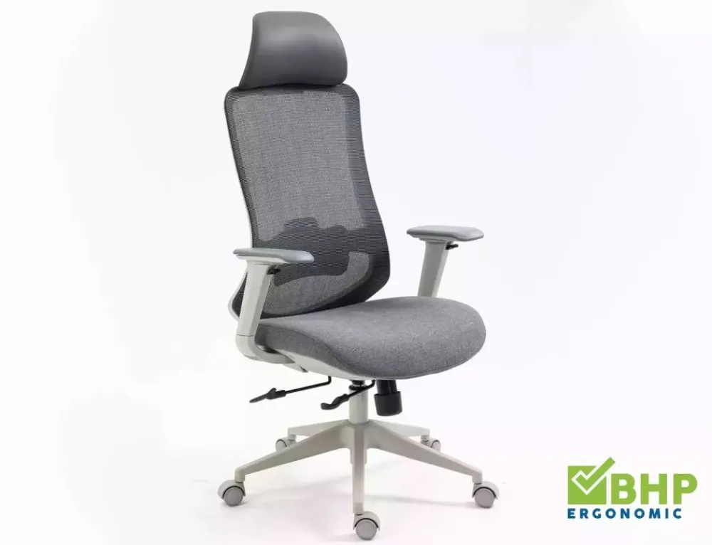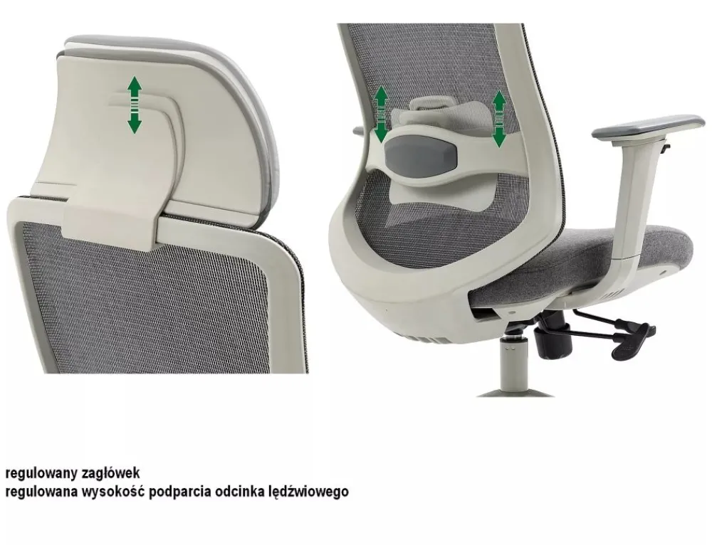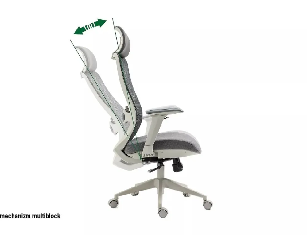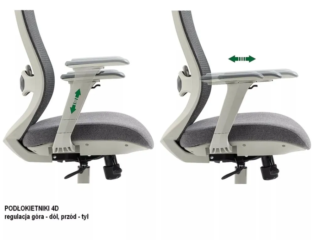 Fotel obrotowy ergonomiczny, spełnia wymogi BHP dotyczące krzeseł biurowych zgodnie z rozporządzeniem Dz. U. poz.2367. Model posiada pozytywną ocenę fizjologiczno-ergonomiczną wydaną przez Instytut Medycyny Pracy (szczegóły w zakładce „PLIKI DO POBRANIA”). Tkanina / skóra syntetyczna / siatka, kolor: szary, stelaż tworzywo, kolor: szary, multiblock, kółka nylonowe, ruchome podłokietniki 4D, regulowany zagłówek oraz odcinek lędźwiowy, regulowana głębokość siedziska, max obciążenie 136kg.