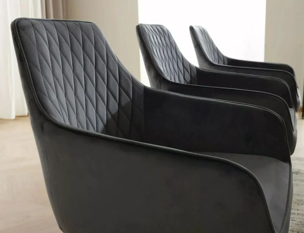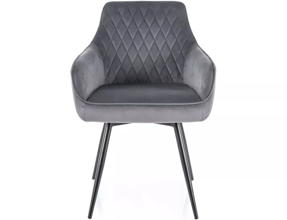 Krzesło, tapicerka: tkanina aksamit: Bluvel 14, stelaż: metal, kolor: szary / czarny mat.Funkcja auto-return – siedzisko obracane w zakresie 180st, z funkcją powrotu do pierwotnej pozycji. Sprężyny kieszeniowe w siedzisku.