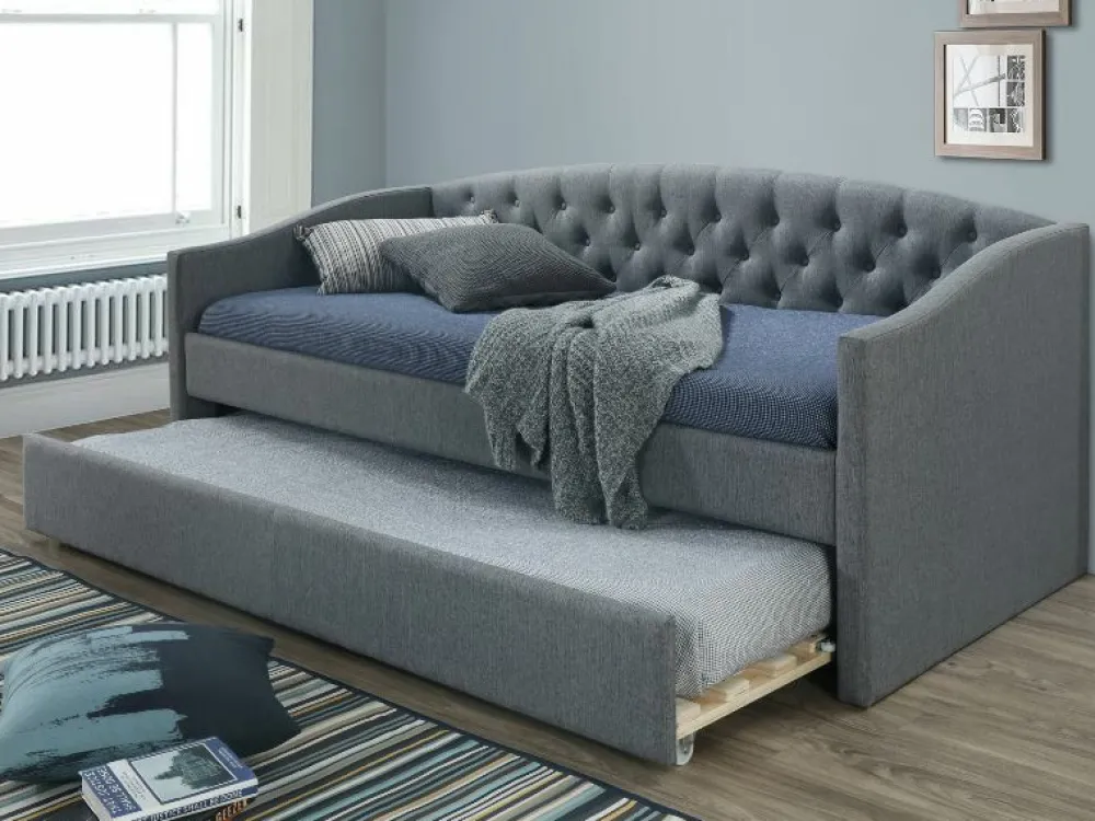 Łóżko z dodatkową powierzchnią do spania, tkanina, kolor: szary, tap. 23. W komplecie stelaż z drewnianych listew. Rozmiar materaca: 90x200cm, dodatkowy: max. 90x195x18cm (cena bez materacy).