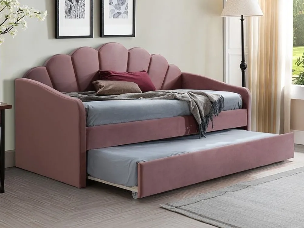 Łóżko z dodatkową powierzchnią do spania, tkanina, kolor: antyczny róż, tap. Bluvel 52. W komplecie stelaż z drewnianych listew. Rozmiar materaca: 90x200cm, dodatkowy: max. 90x195x18cm (cena bez materaca).