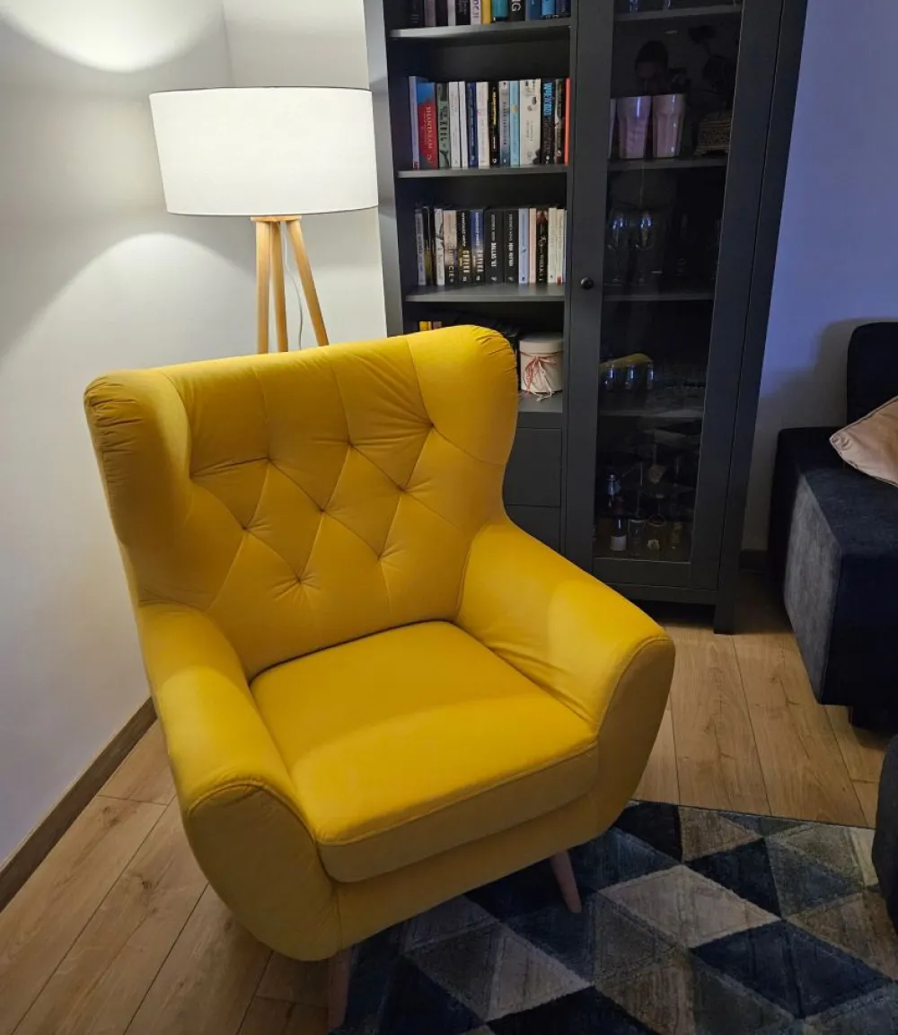 Fotel dostępny jest w unikatowej tkaninie o soczystym, żółtym odcieniu Solo Idesin col. 257. Tkanina jest welwetowa, bardzo przyjemna i gładka w dotyku. Dodatkowo tkanina jest hydrofobowa! – technologia Nano Block.