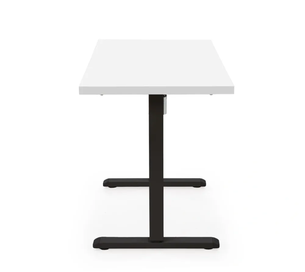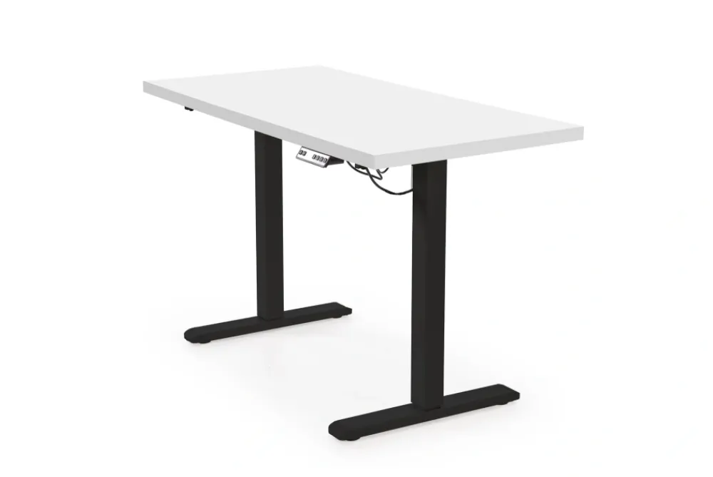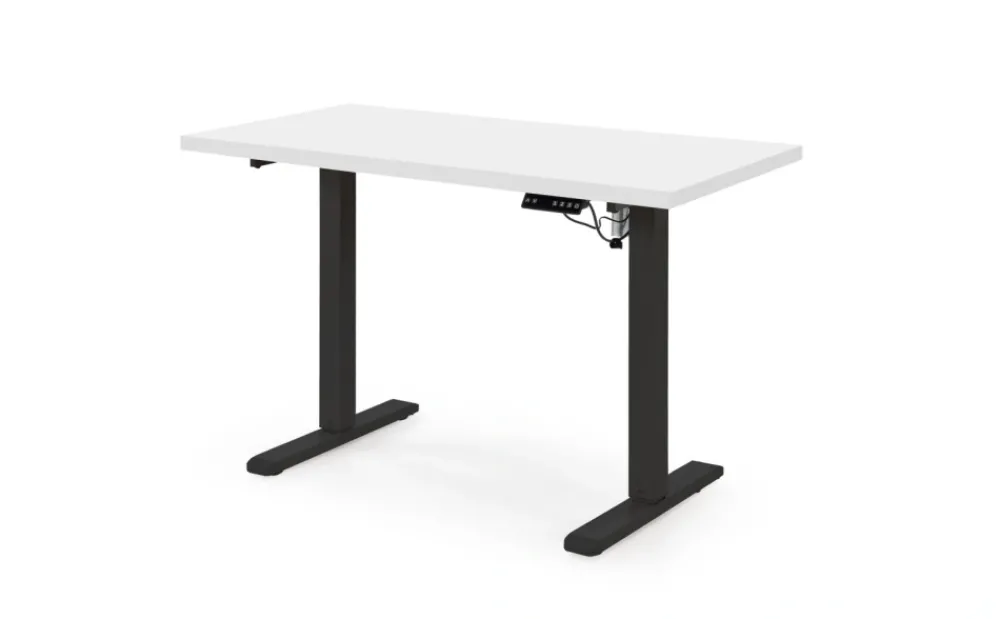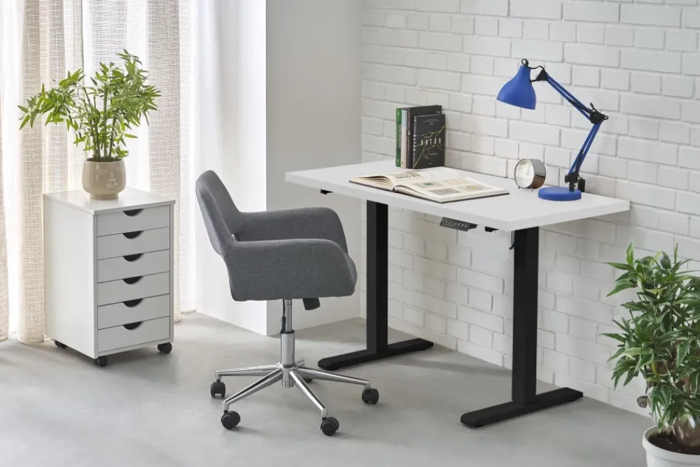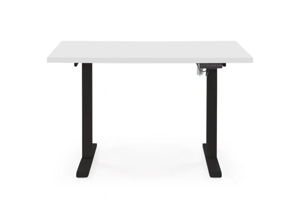 wymiary: 120/60/75-120 cm, biurko z funkcją regulacji wysokości, materiał: płyta meblowa laminowana / stal malowana proszkow, kolory: blat – biały, stelaż – czarny