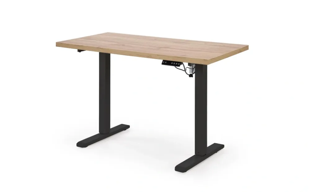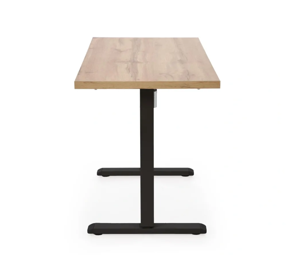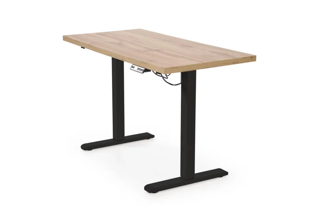 wymiary: 120/60/75-120 cm, biurko z funkcją regulacji wysokości, materiał: płyta meblowa laminowana / stal malowana proszkow, kolory: blat – dąb artisan, stelaż – czarny