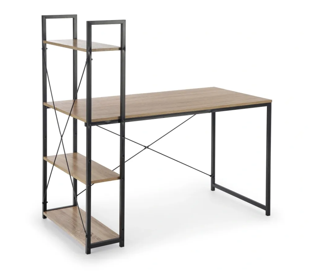 wymiary: 120/64/120 cm, materiał: płyta meblowa laminowana / stal malowana proszkowo, kolor: czarny – dąb sonoma, możliwość montażu regału po lewej lub prawej stronie