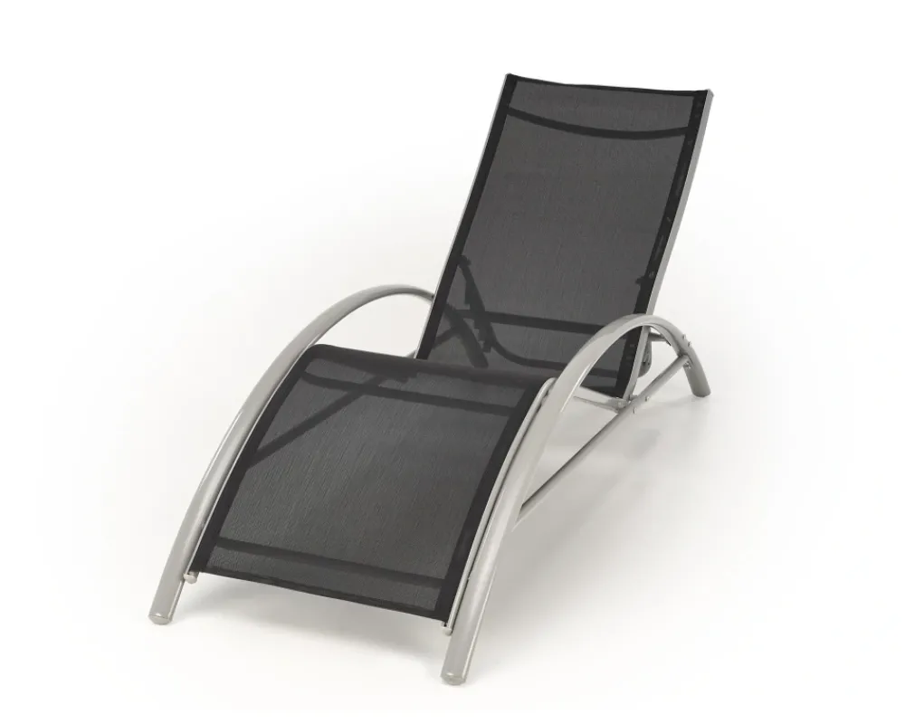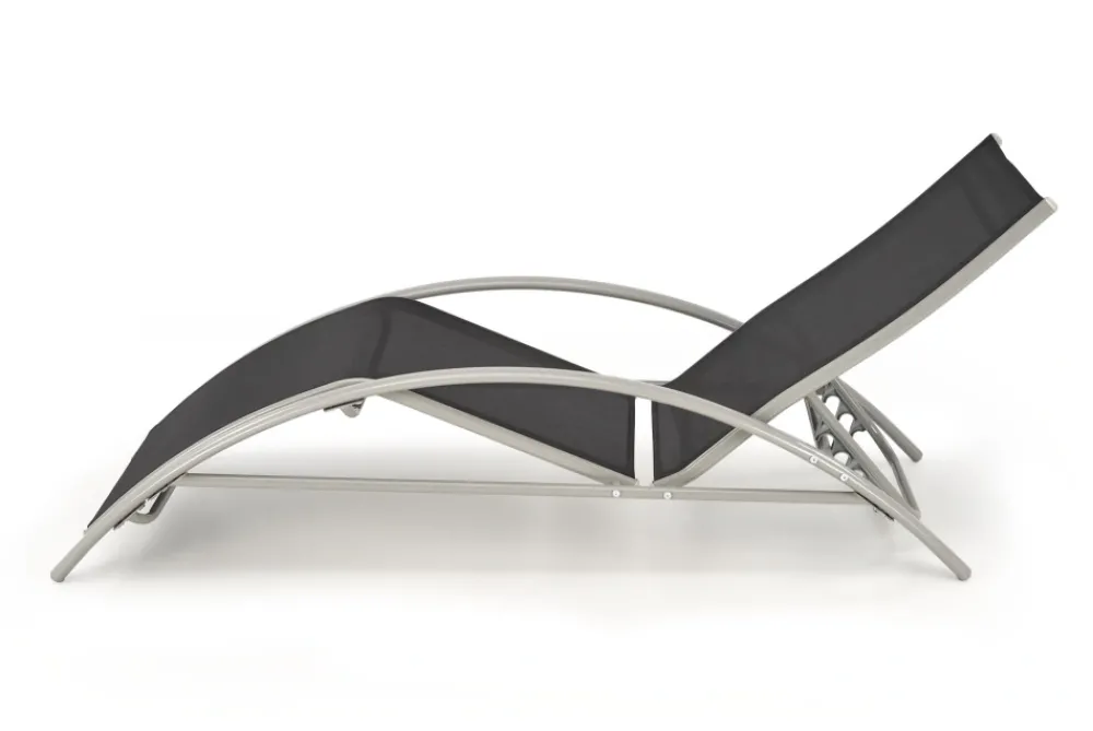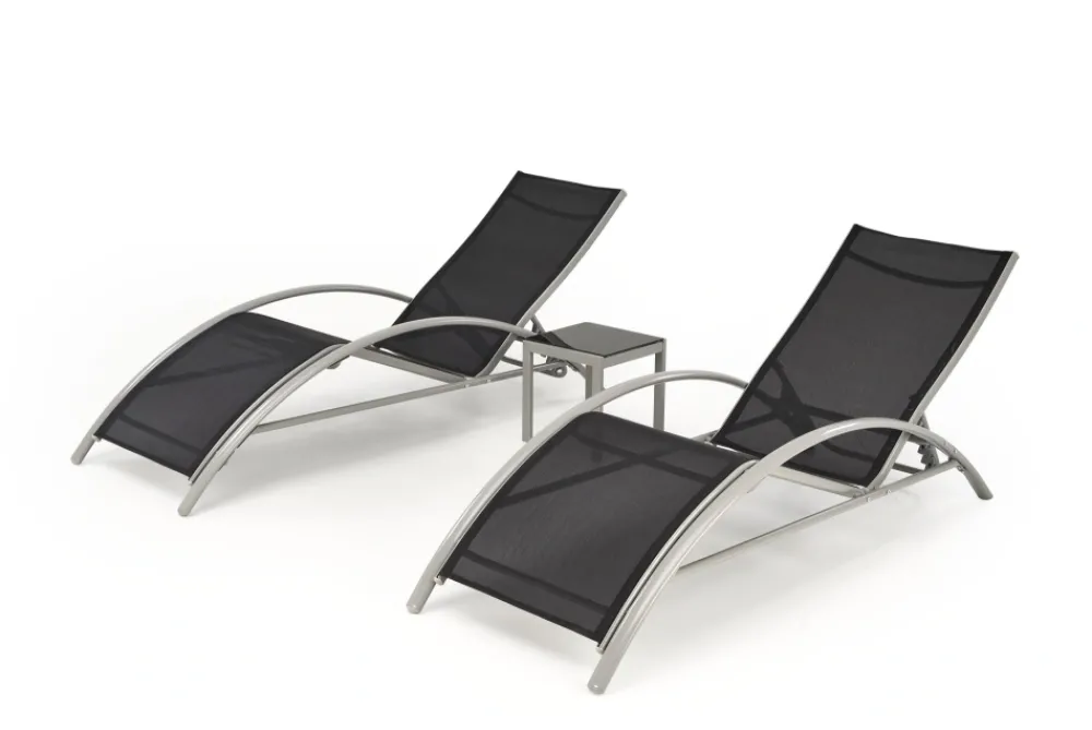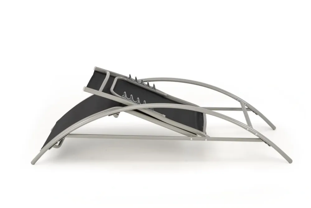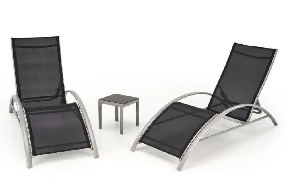 zestaw 2 leżaków ze stolikiem, wymiary: 160/60/66-92 cm – leżak, 30/30/30 cm – stolik, materiał: siatka / stal malowana proszkowo, kolor: czarny / jasny popiel