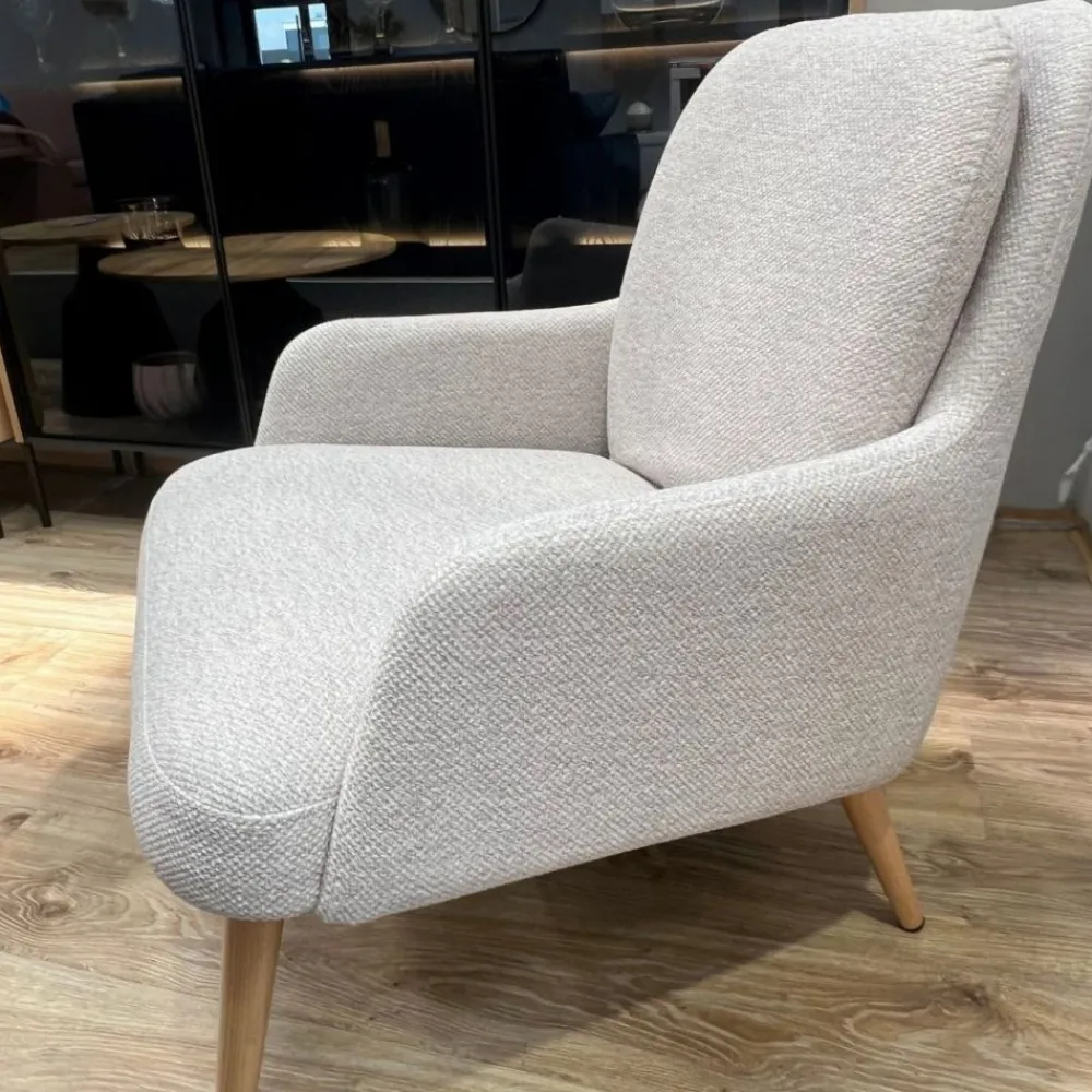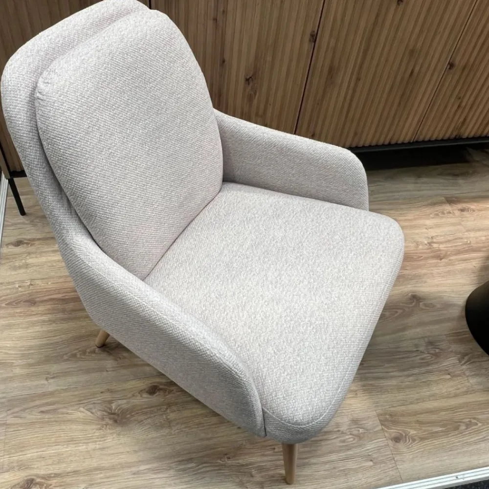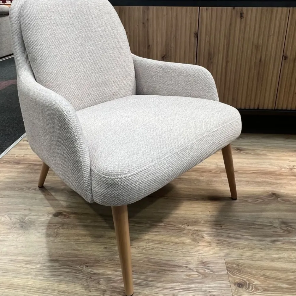Nowoczesny fotel z drewnianymi nogami Oliver to mebel, który wyróżnia się lekkością formy i elegancją detali. Smukłe, zwężane nogi z drewna (wysokość 28 cm) nawiązują do stylu skandynawskiego, dodając wnętrzu wizualnej lekkości. Zaokrąglone linie i subtelna kolorystyka doskonale komponują się z wnętrzami w stylu japandi, soft loft czy boho. Fotel idealnie sprawdzi się jako akcent dekoracyjny, który równocześnie pełni praktyczną funkcję. Jasny kolor tkaniny optycznie powiększa przestrzeń i pasuje zarówno do chłodnych, jak i ciepłych tonacji.